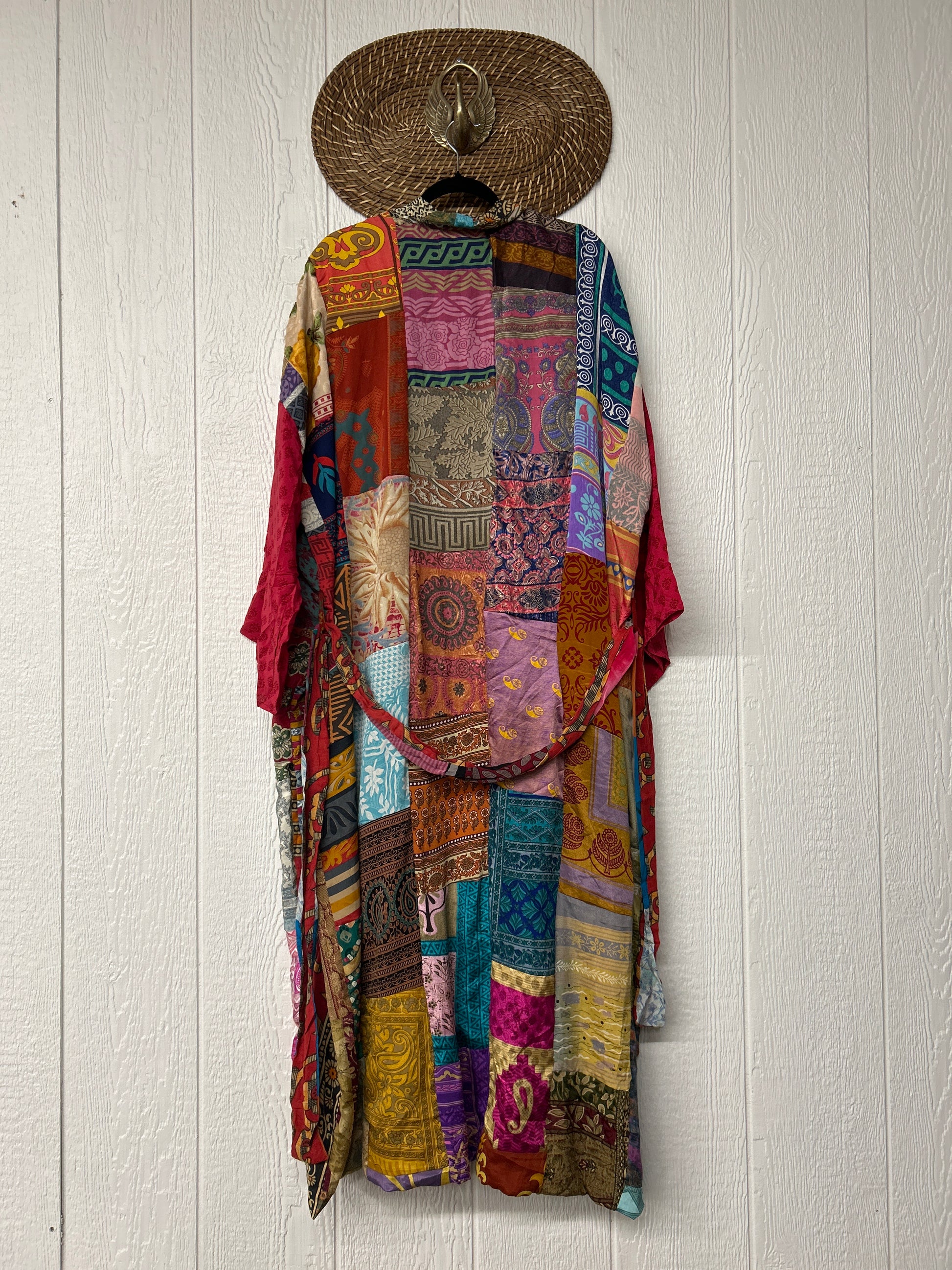 Patchwork outer garment is made from rasgulla and crepe sari and fully lined in printed cotton sari. Features slouchy outer pockets and a tie sash closure. Wide sleeves are crafted from unlined crepe silk for extra dimension.