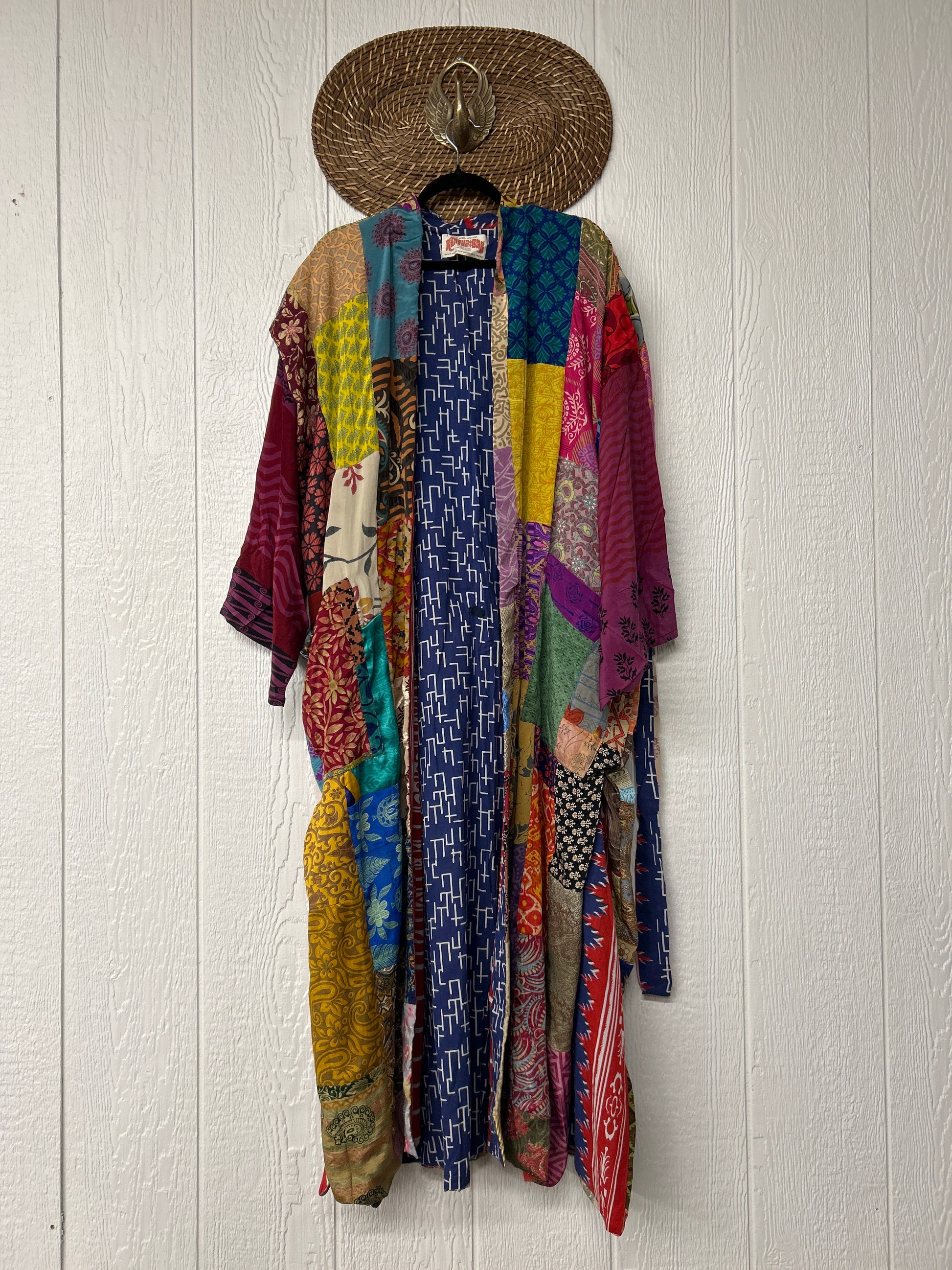 Patchwork outer garment is made from rasgulla and crepe sari and fully lined in printed cotton sari. Features slouchy outer pockets and a tie sash closure. Wide sleeves are crafted from unlined crepe silk for extra dimension.
