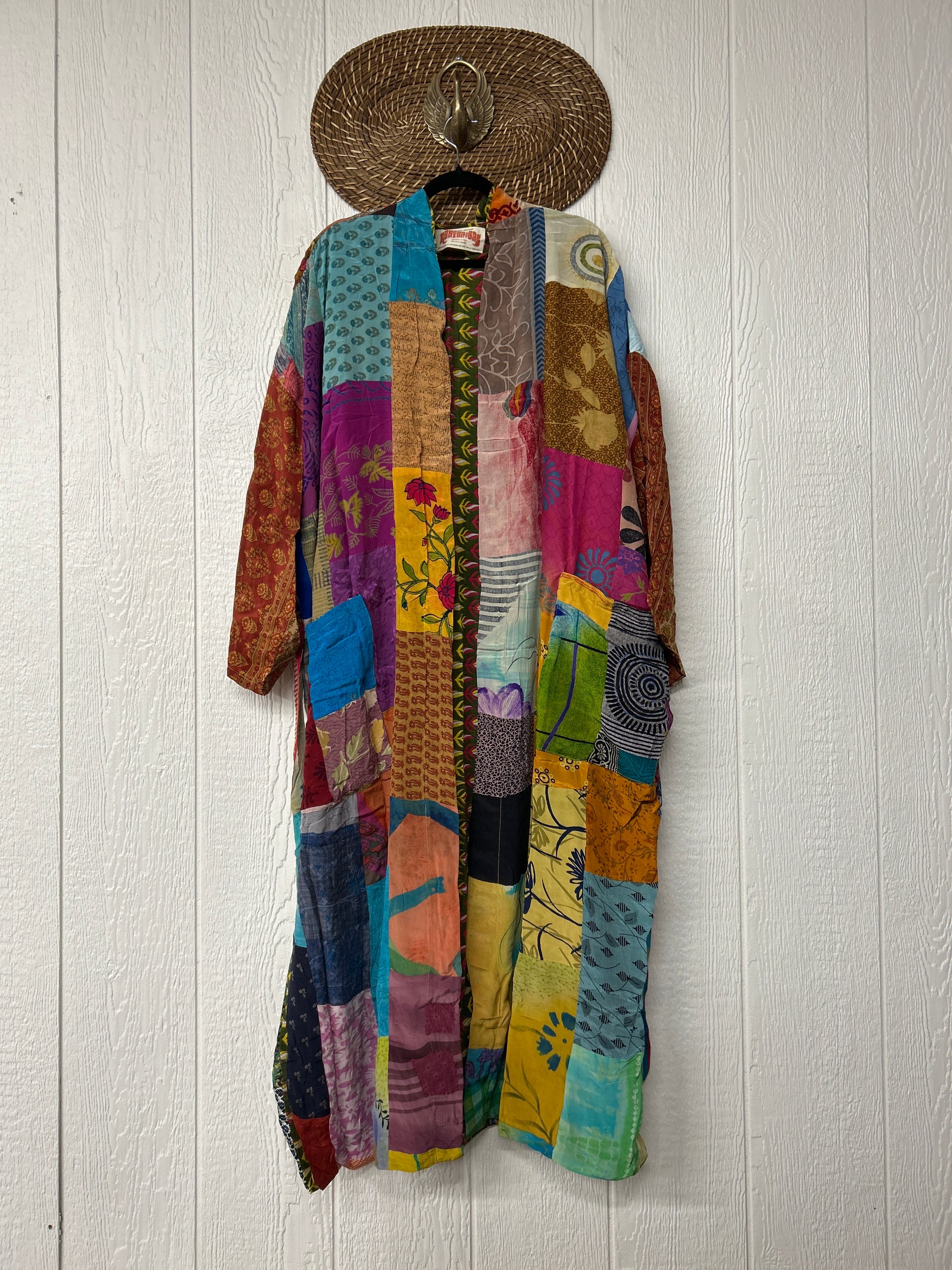 Patchwork outer garment is made from rasgulla and crepe sari and fully lined in printed cotton sari. Features slouchy outer pockets and a tie sash closure. Wide sleeves are crafted from unlined crepe silk for extra dimension.
