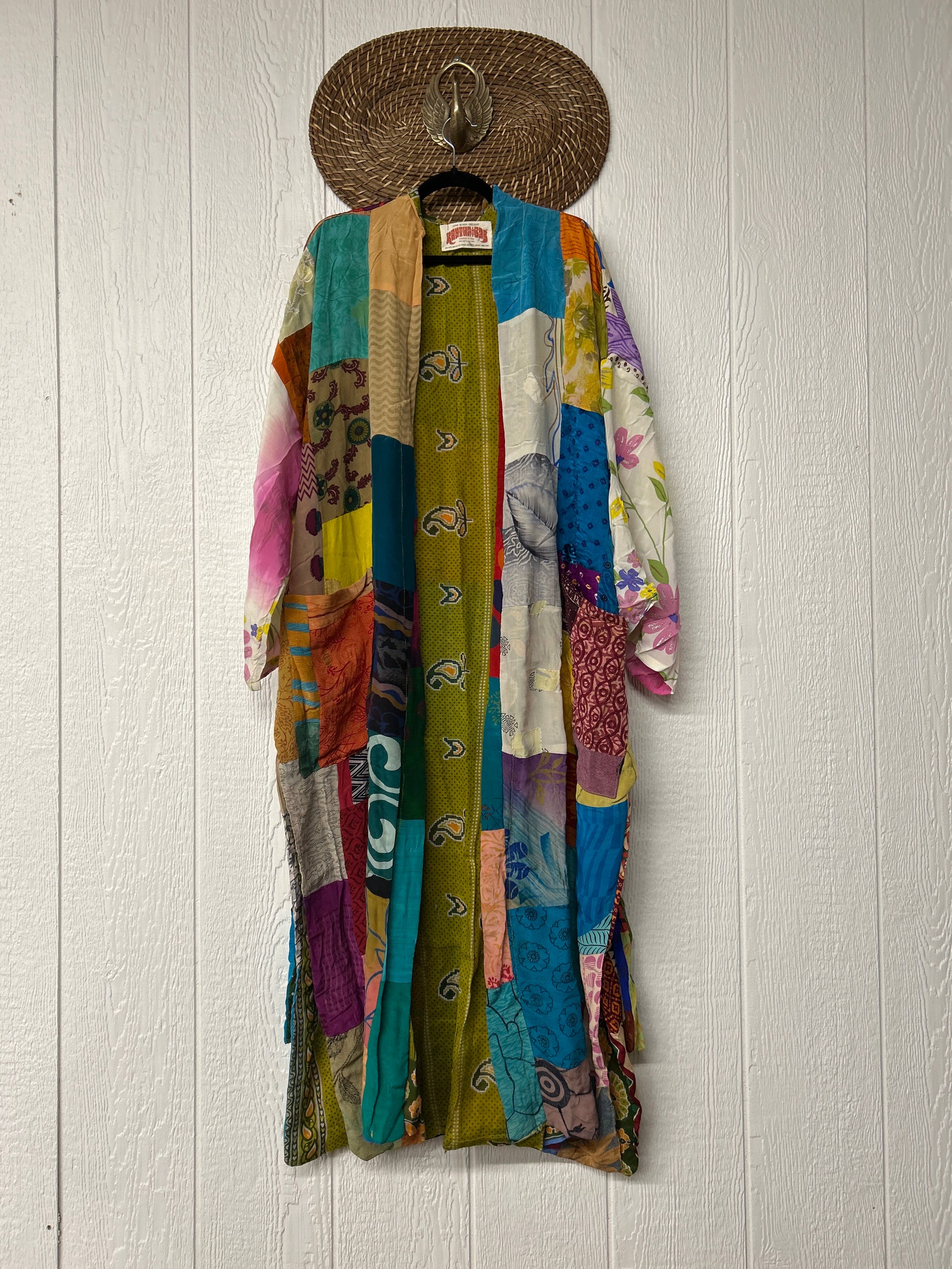 Patchwork outer garment is made from rasgulla and crepe sari and fully lined in printed cotton sari. Features slouchy outer pockets and a tie sash closure. Wide sleeves are crafted from unlined crepe silk for extra dimension.