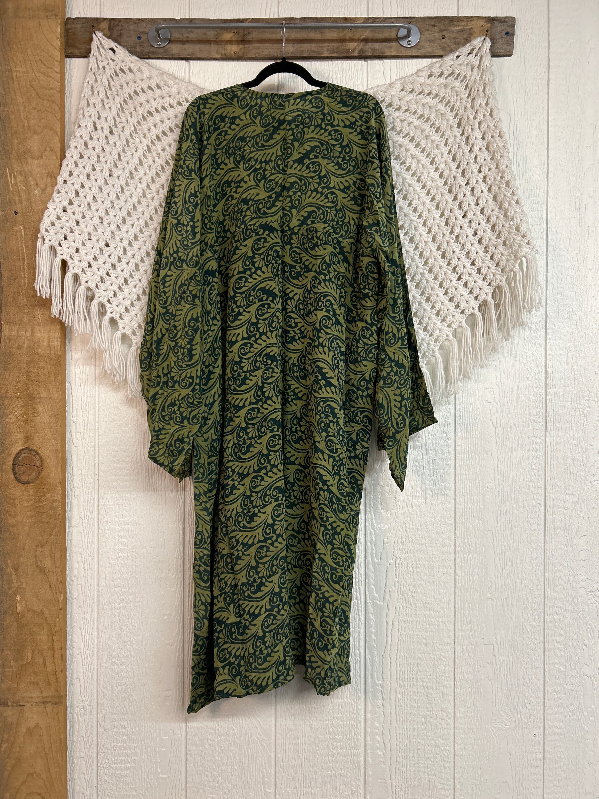 Crafted from our ultra lux vintage crepe sari this floaty dream features wide bell sleeves, deep v neckline, maxi silhouette with side slits for extra dimension.