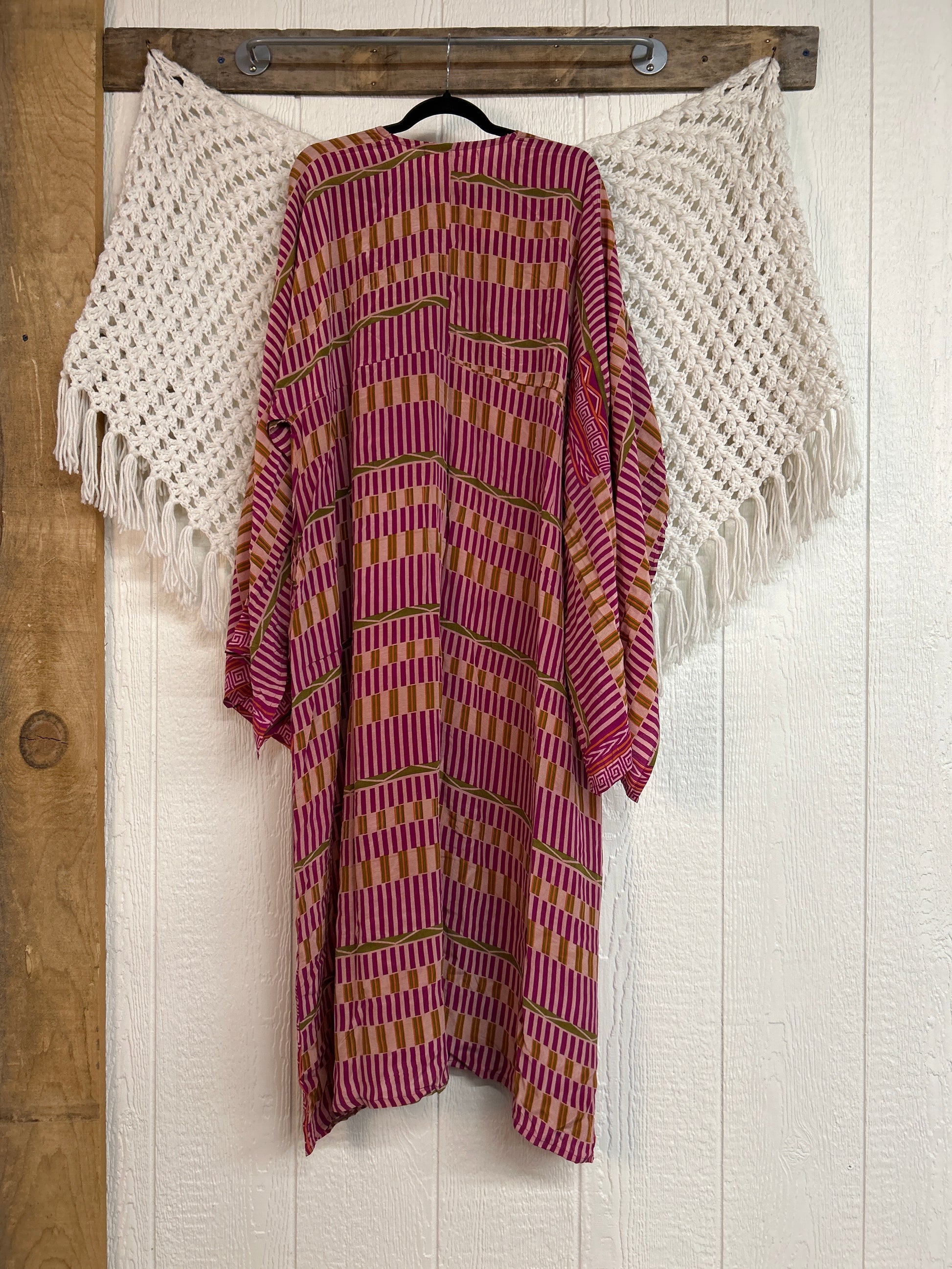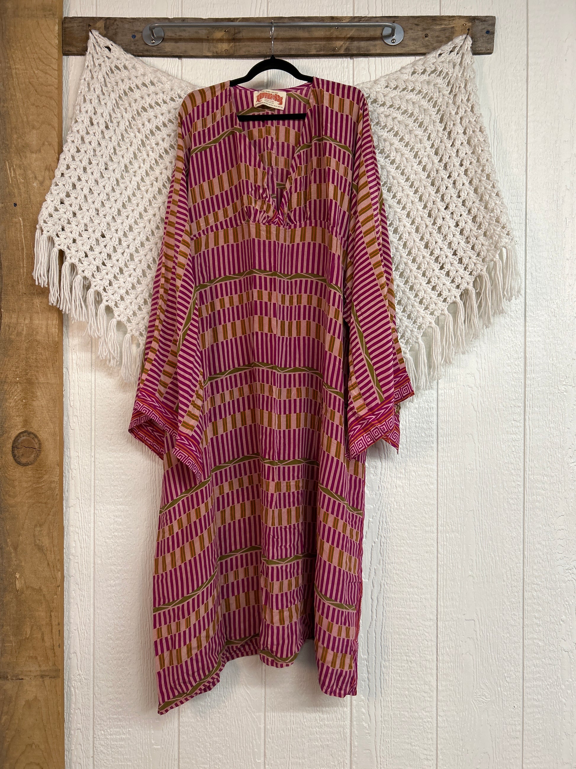 Crafted from our ultra lux vintage crepe sari this floaty dream features wide bell sleeves, deep v neckline, maxi silhouette with side slits for extra dimension.