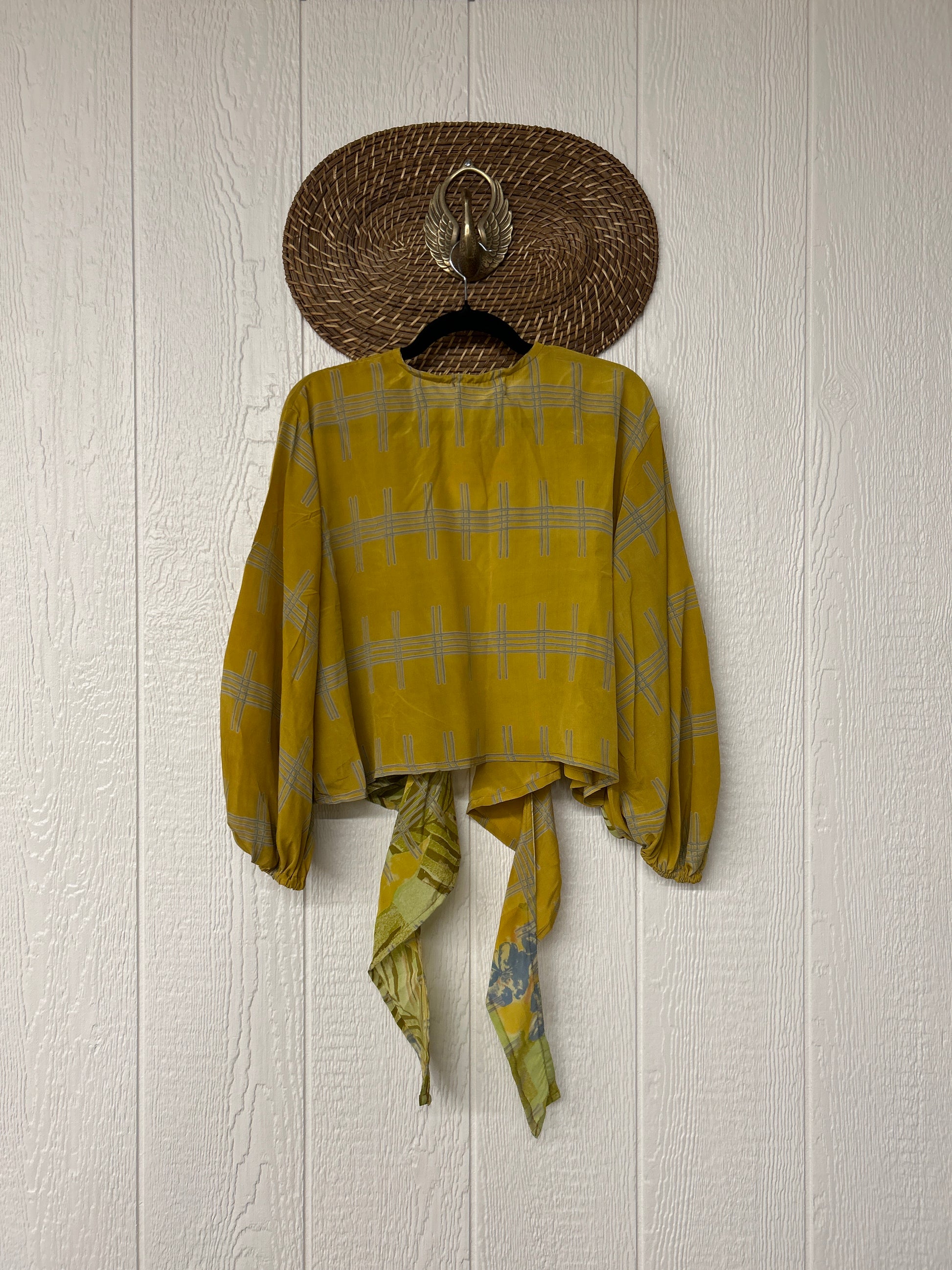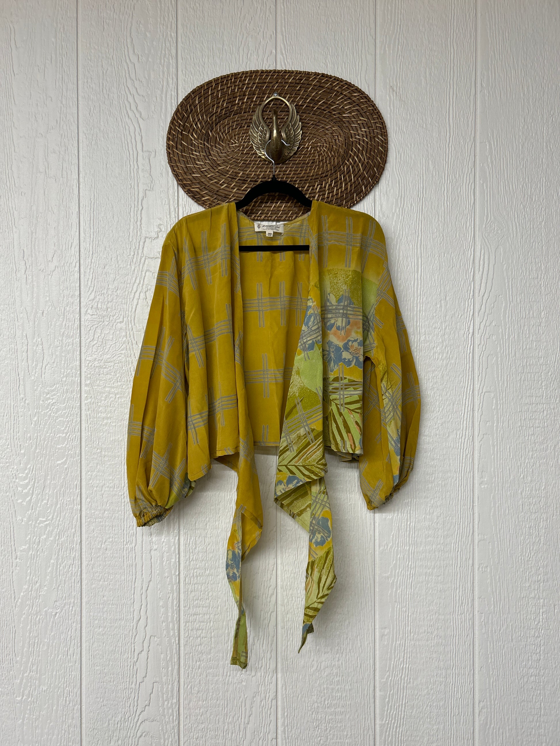 Crafted from vintage crepe silk sari this floaty layer features bounce bell sleeves and a tie closure long enough to wrap around your body. We know this will be one of your new favorites.