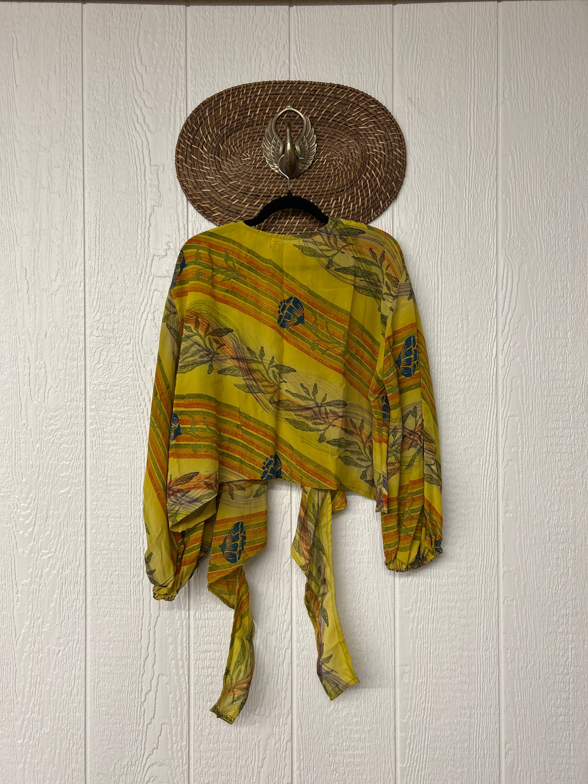 Crafted from vintage crepe silk sari this floaty layer features bounce bell sleeves and a tie closure long enough to wrap around your body. We know this will be one of your new favorites.