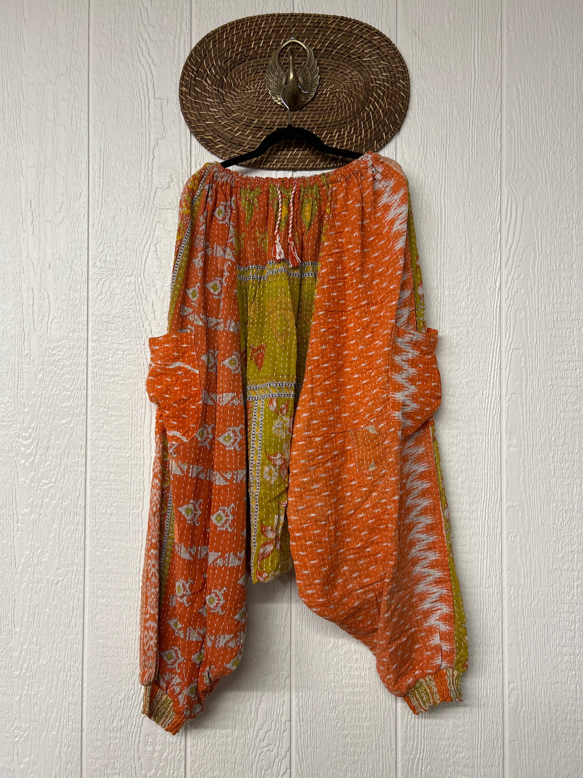 Made from our vintage kantha cotton sari with a super slouchy low harem crotch drop, slouchy exterior pockets, elastic waist with drawstring snd soft smocked elastic on the ankles.