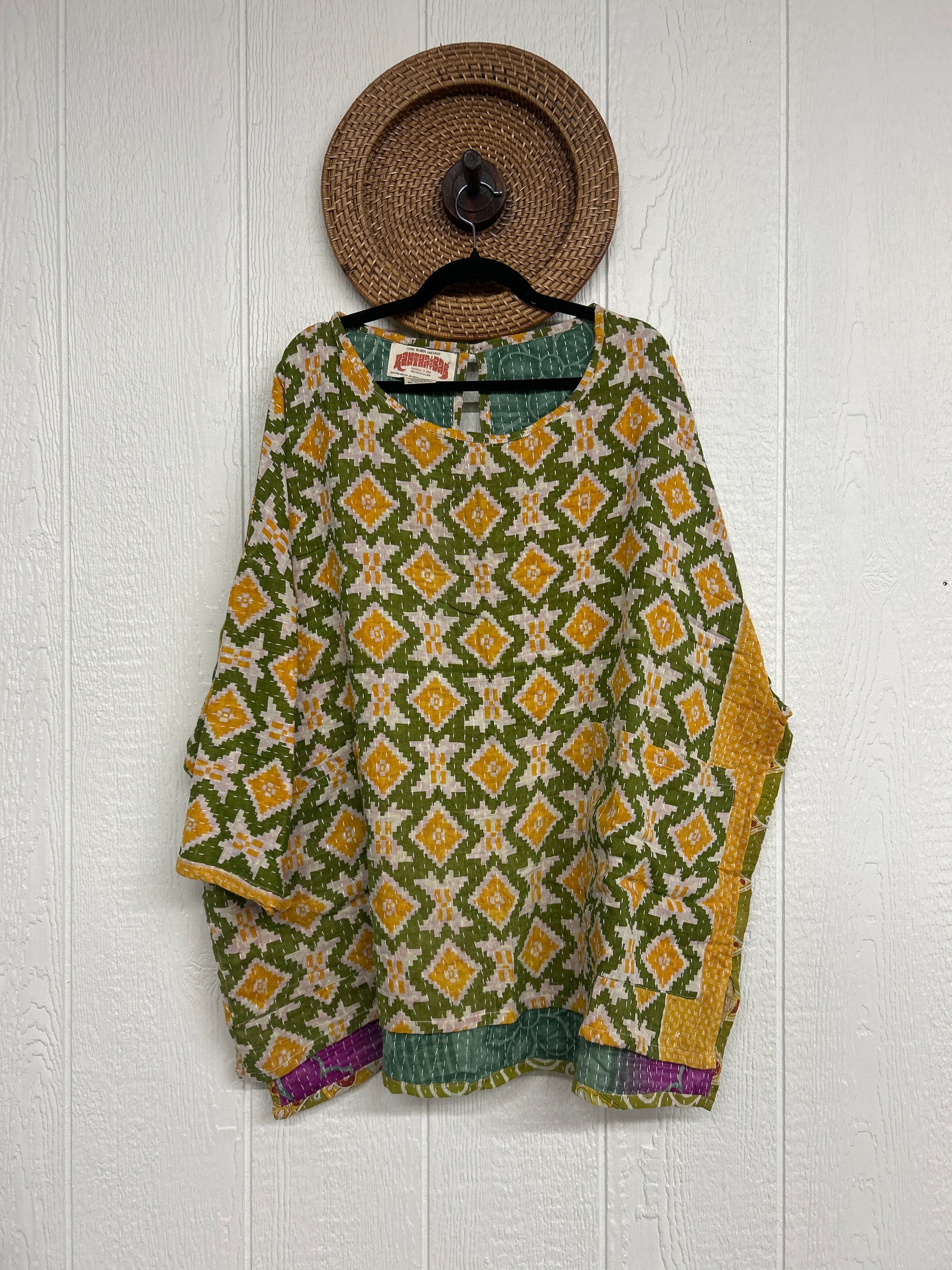 Features key hole in the back, slouchy pockets, a scoop neckline, high low hem with side slits for extra dimension. The Kantha Dream Pullover is fully reversible giving you two tops in one. We know it will be your new go to.
