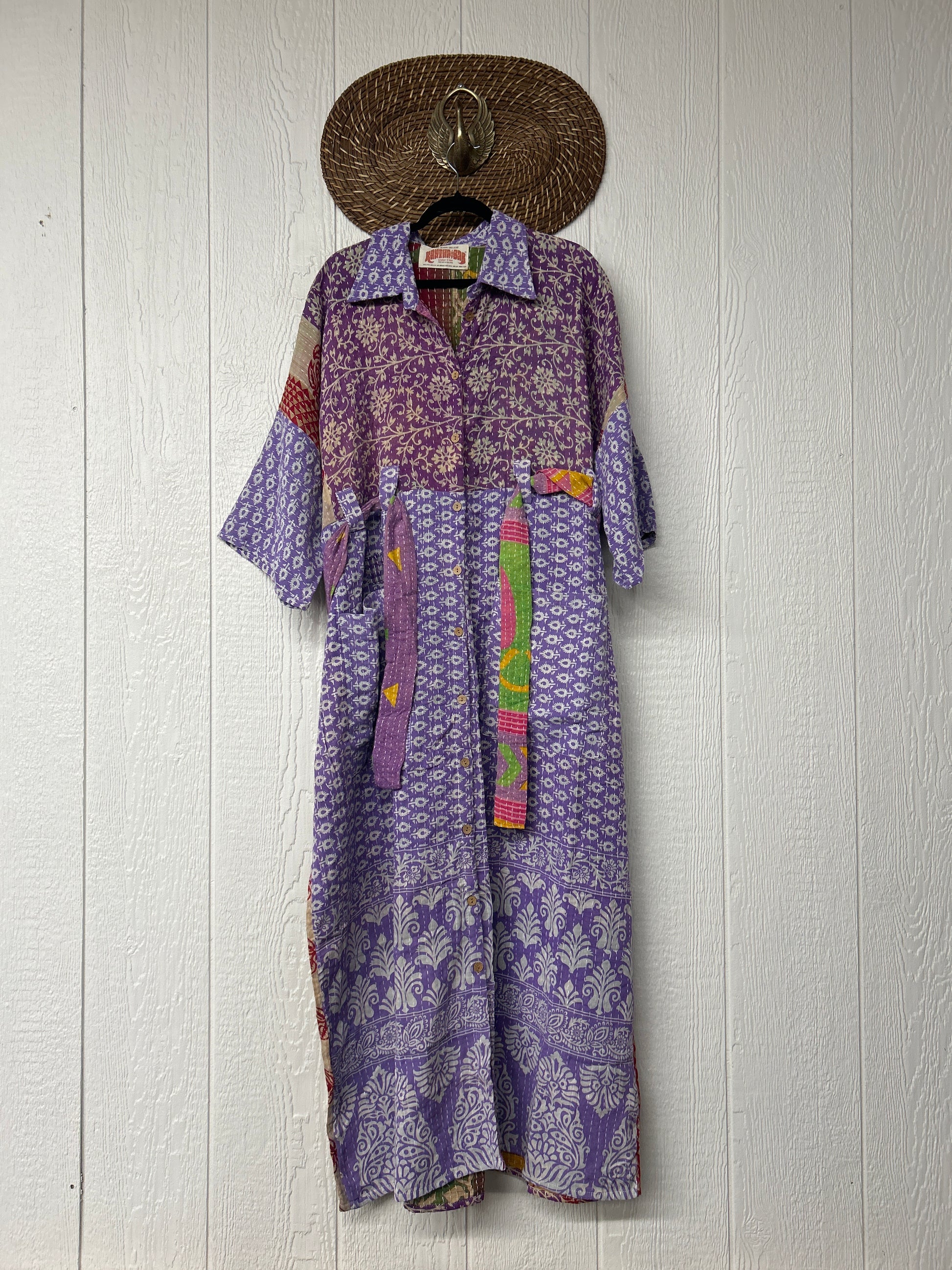 Crafted from our ultra-luxe Kantha stitch vintage cotton sari the Gravity Duster Dress features a button down front placket, adjustable belt.