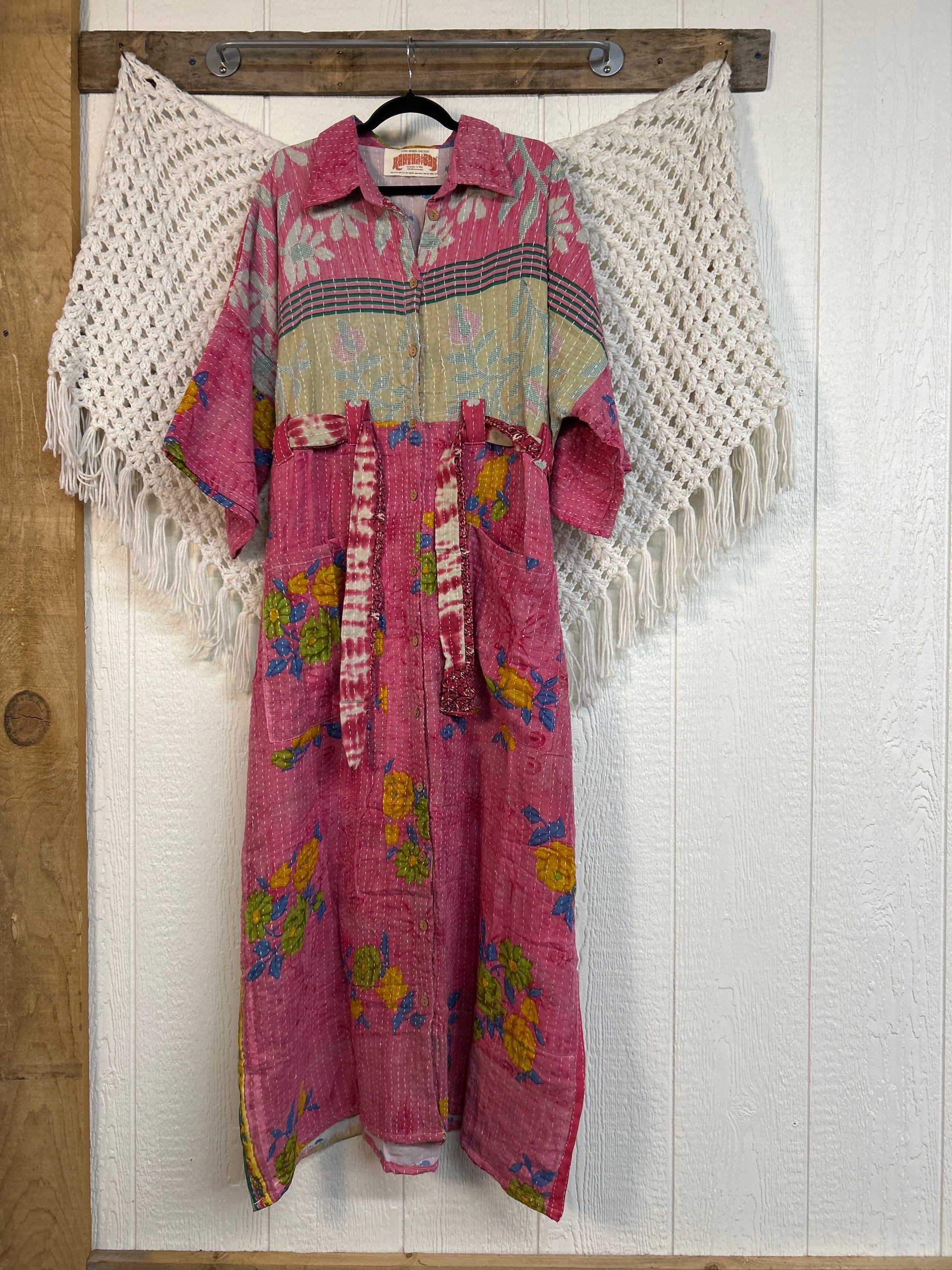 Crafted from our ultra-luxe Kantha stitch vintage cotton sari the Gravity Duster Dress features a button down front placket, adjustable belt.