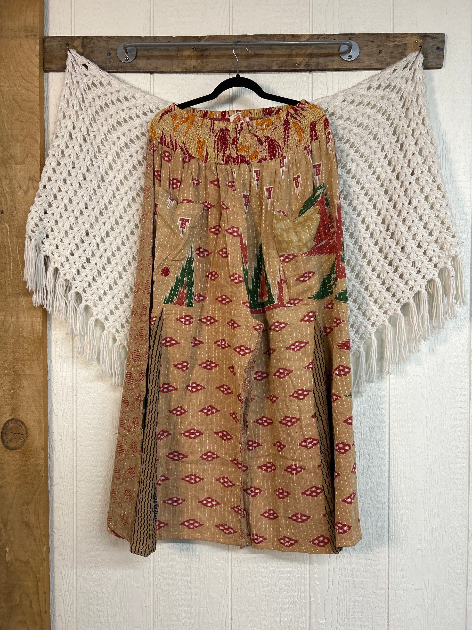 Crafted from our ultra lux vintage cotton kantha stitched sari these floaty pants feature super wide legs with front and back vintage crepe inserts that make your pants dance when you walk. Front slouchy pockets are deep enough to fill with your treasures.