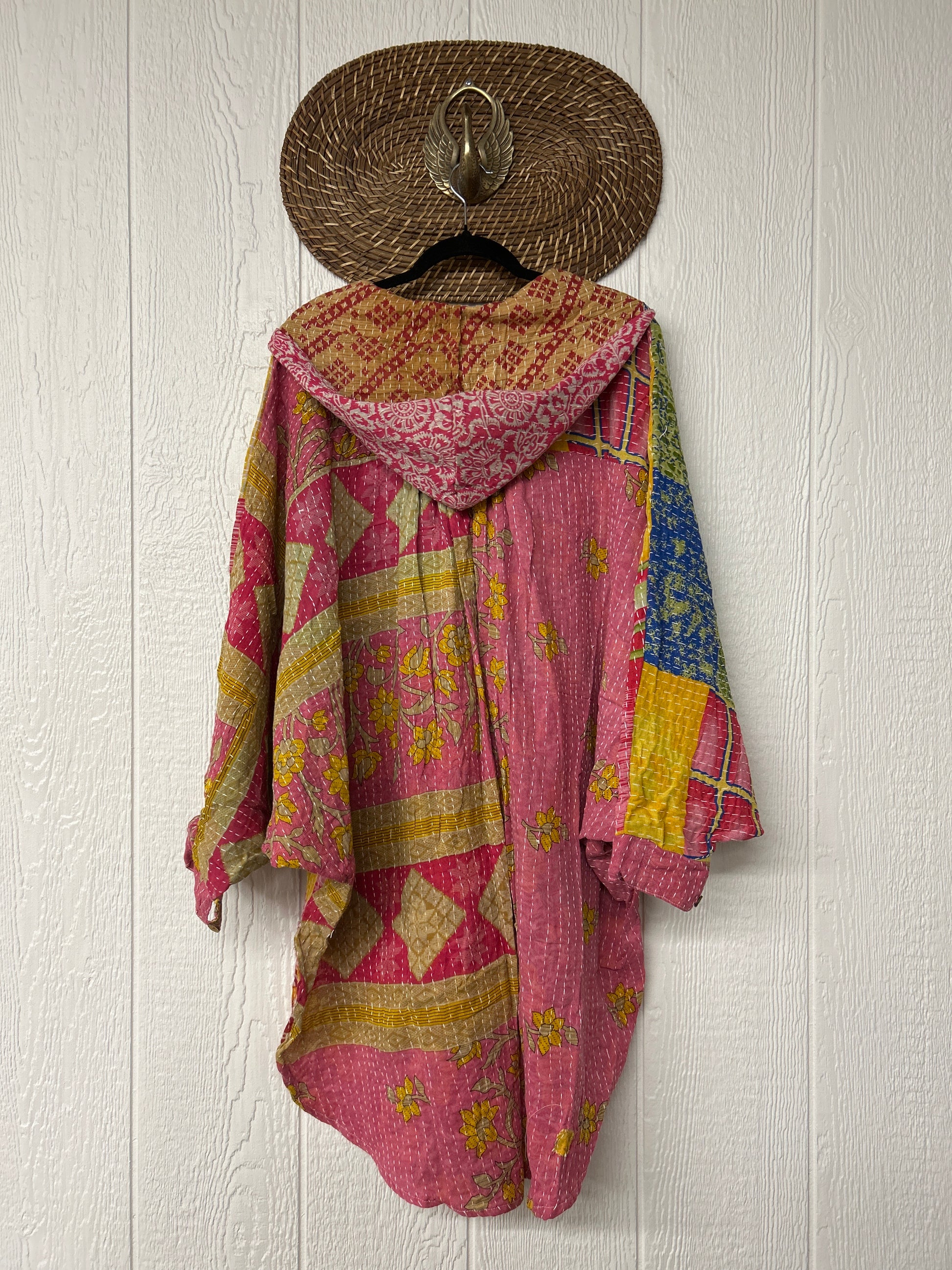 Made from our hand kantha stitched vintage cotton sari, this piece of wearable art features a Button-down opening with functional buttons, slouchy outer pockets, billowy sleeves, a rounded hemline and a vibey hood. The perfect top to compliment your favorite kantha pants or bell bottoms.