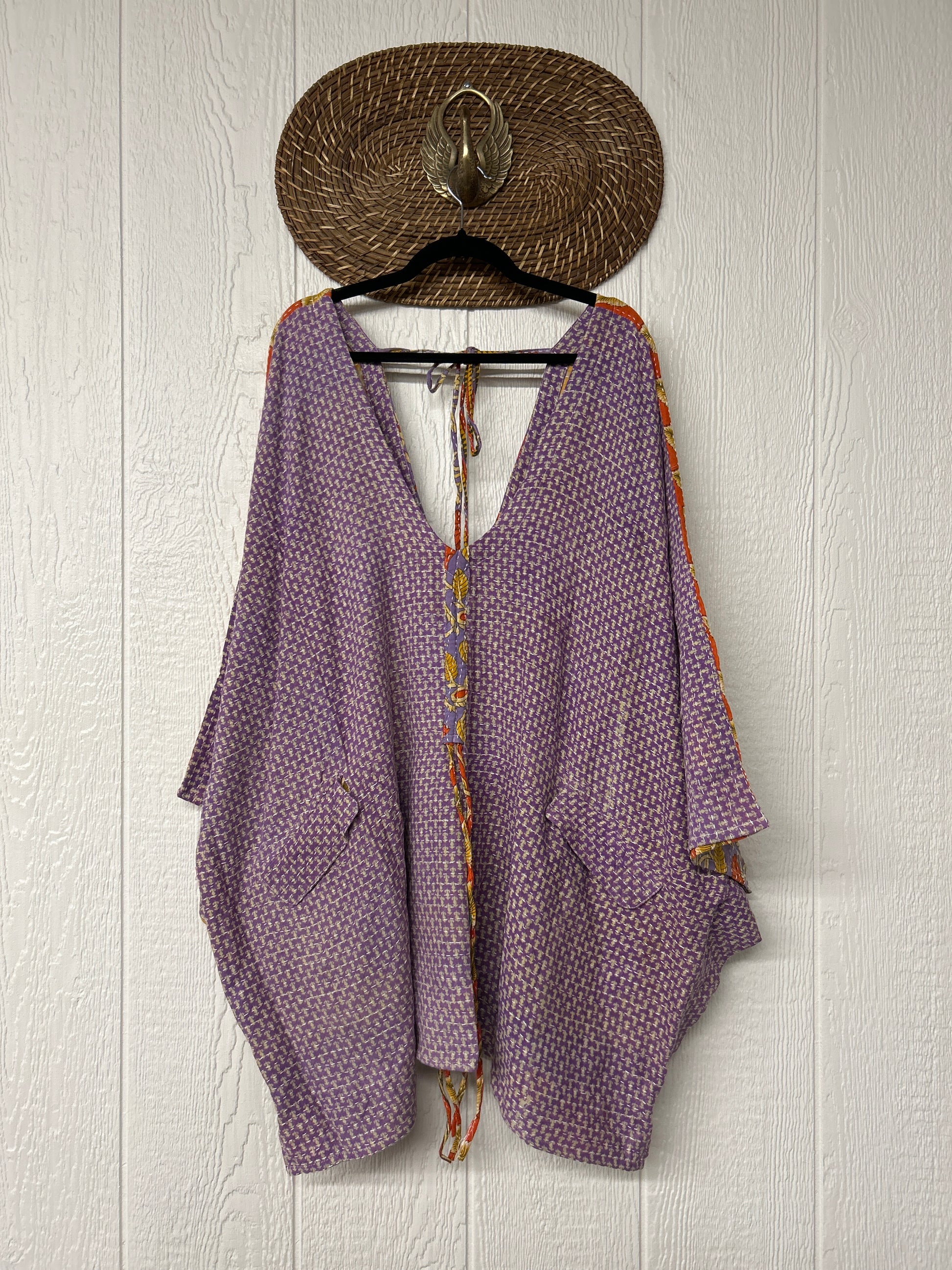 Fabrics may have small threads or holes in the layers. Color inconsistency or small stains may be present. The saris are sewn together and extend the life of each design. Imperfections should be celebrated.