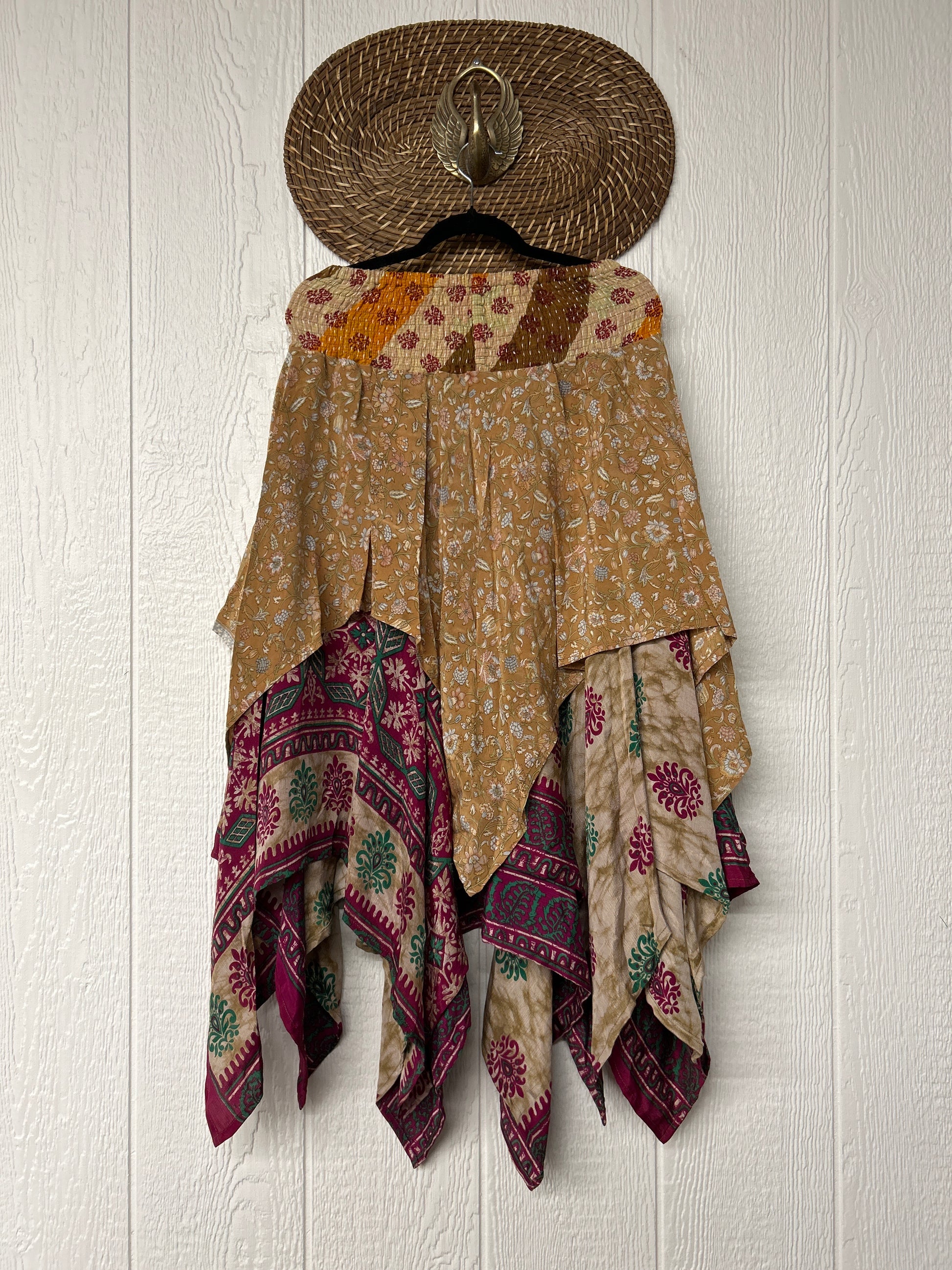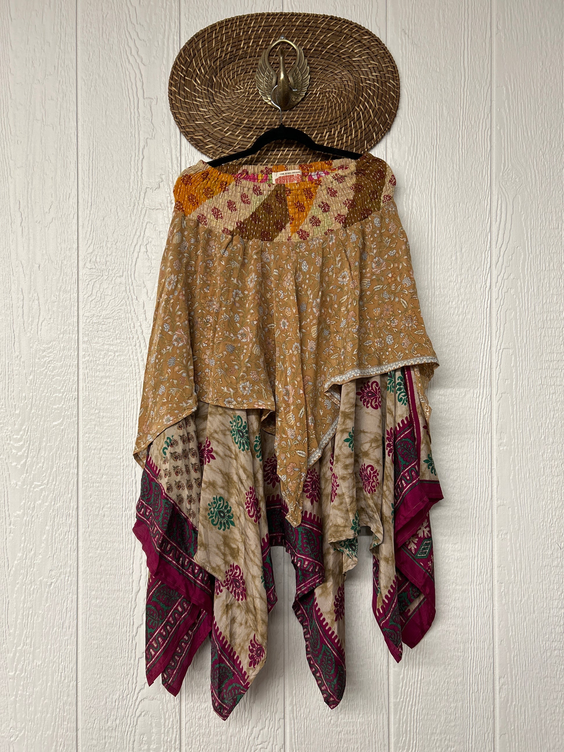 crafted from our ultra lux vintage crepe and ragulla sari. Features a rock star asymmetrical hem and stretchy pareo kantha waistband. This versatile piece can be pulled up to be worn as a tunic!