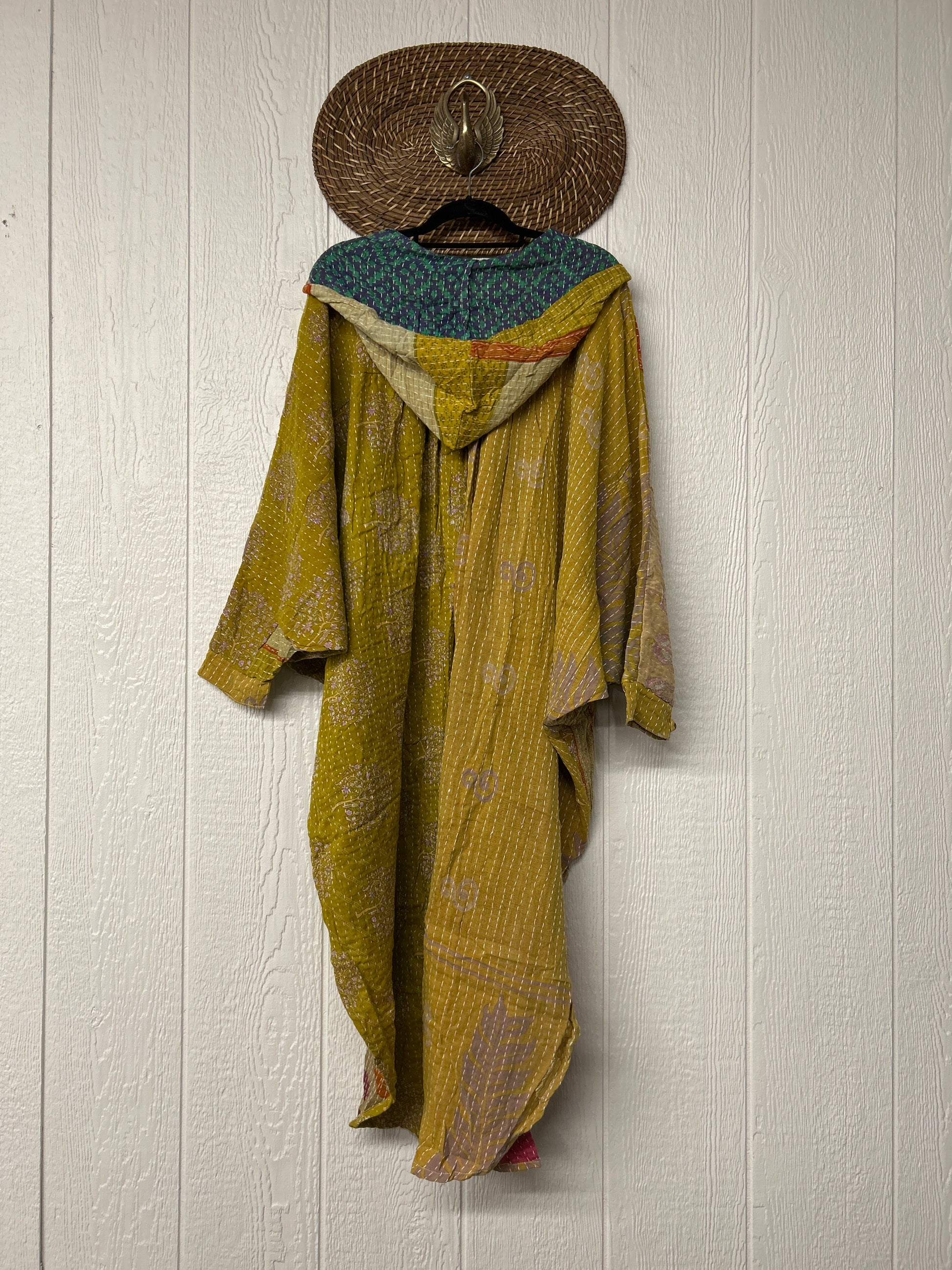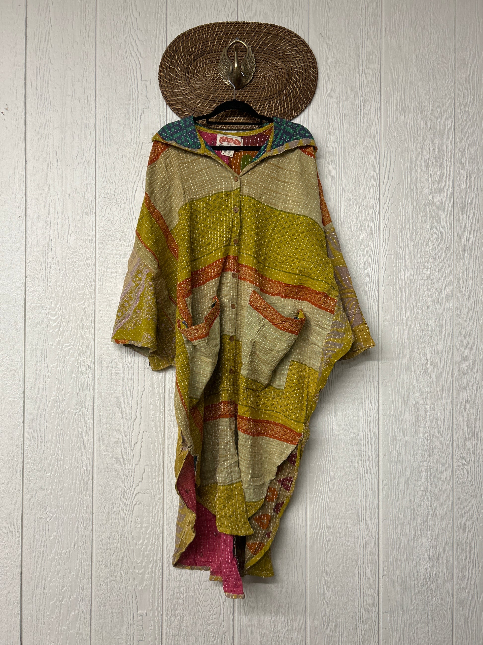 Made from our hand kantha stitched vintage cotton sari, this piece of wearable art features a Button-down opening with functional buttons, slouchy outer pockets, billowy sleeves, a rounded hemline and a vibey hood. The perfect maxi to compliment your favorite kantha pants or bell bottoms.