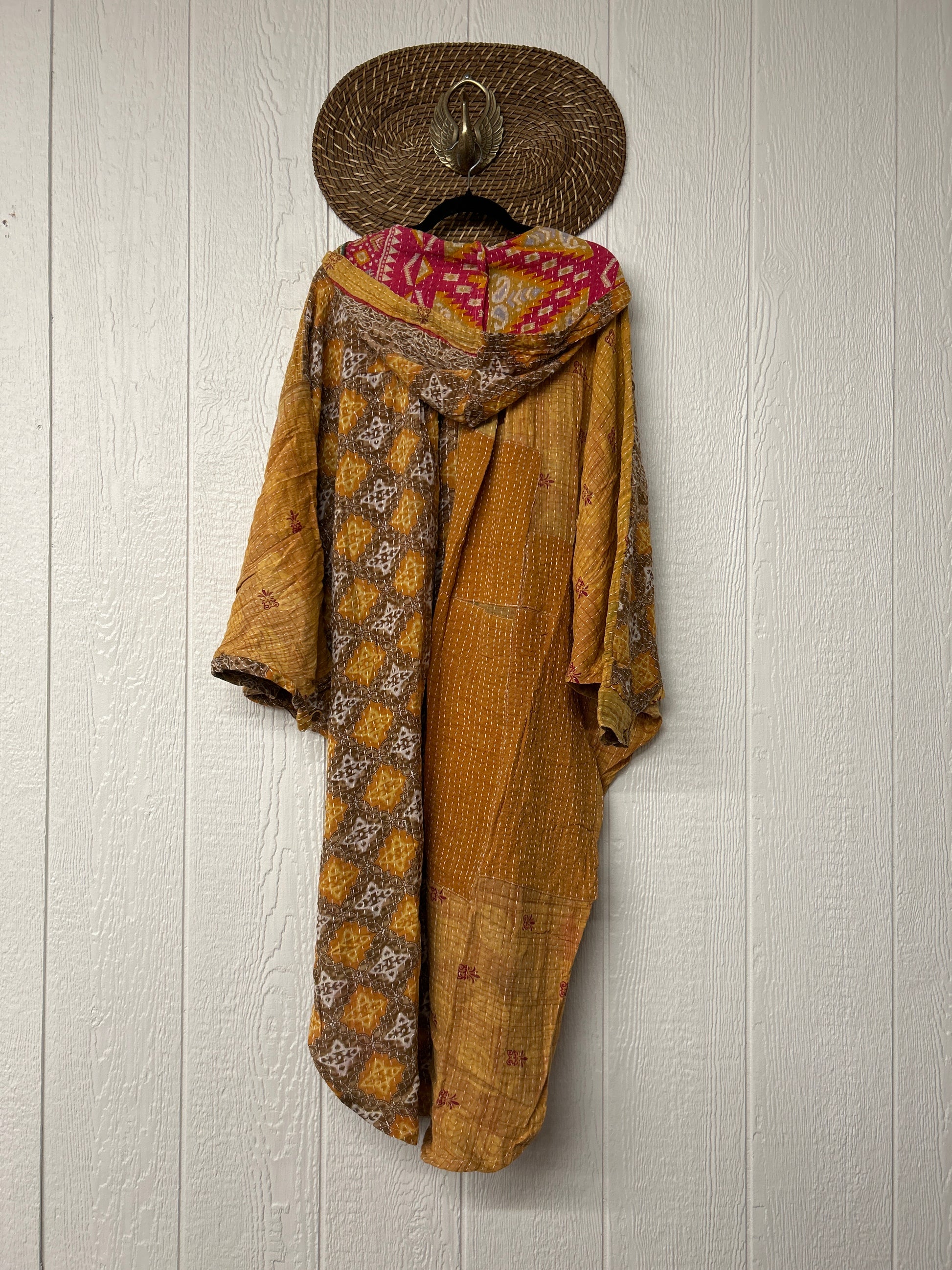 Made from our hand kantha stitched vintage cotton sari, this piece of wearable art features a Button-down opening with functional buttons, slouchy outer pockets, billowy sleeves, a rounded hemline and a vibey hood. The perfect maxi to compliment your favorite kantha pants or bell bottoms.