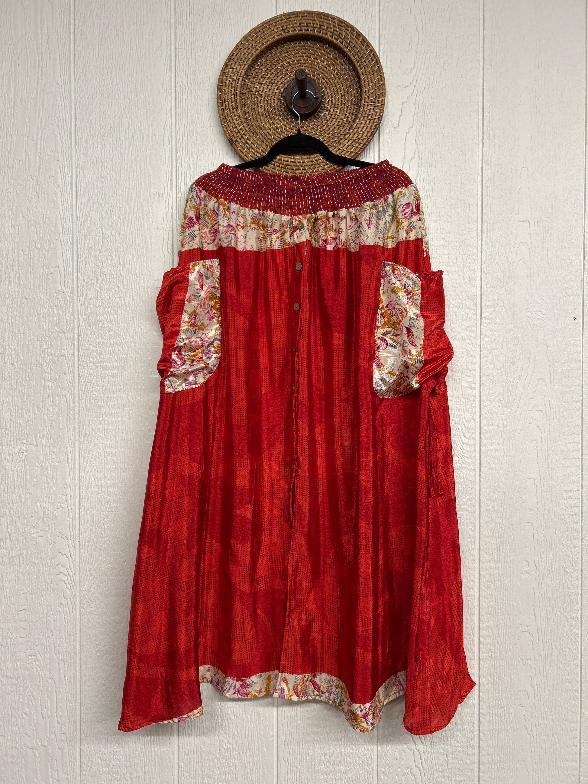 Crafted from rasgulla sari, this absolute dream features slouchy side pockets with a butterfly drawstring to cinch the sides, a button front skirt and a stretchy free size waist.