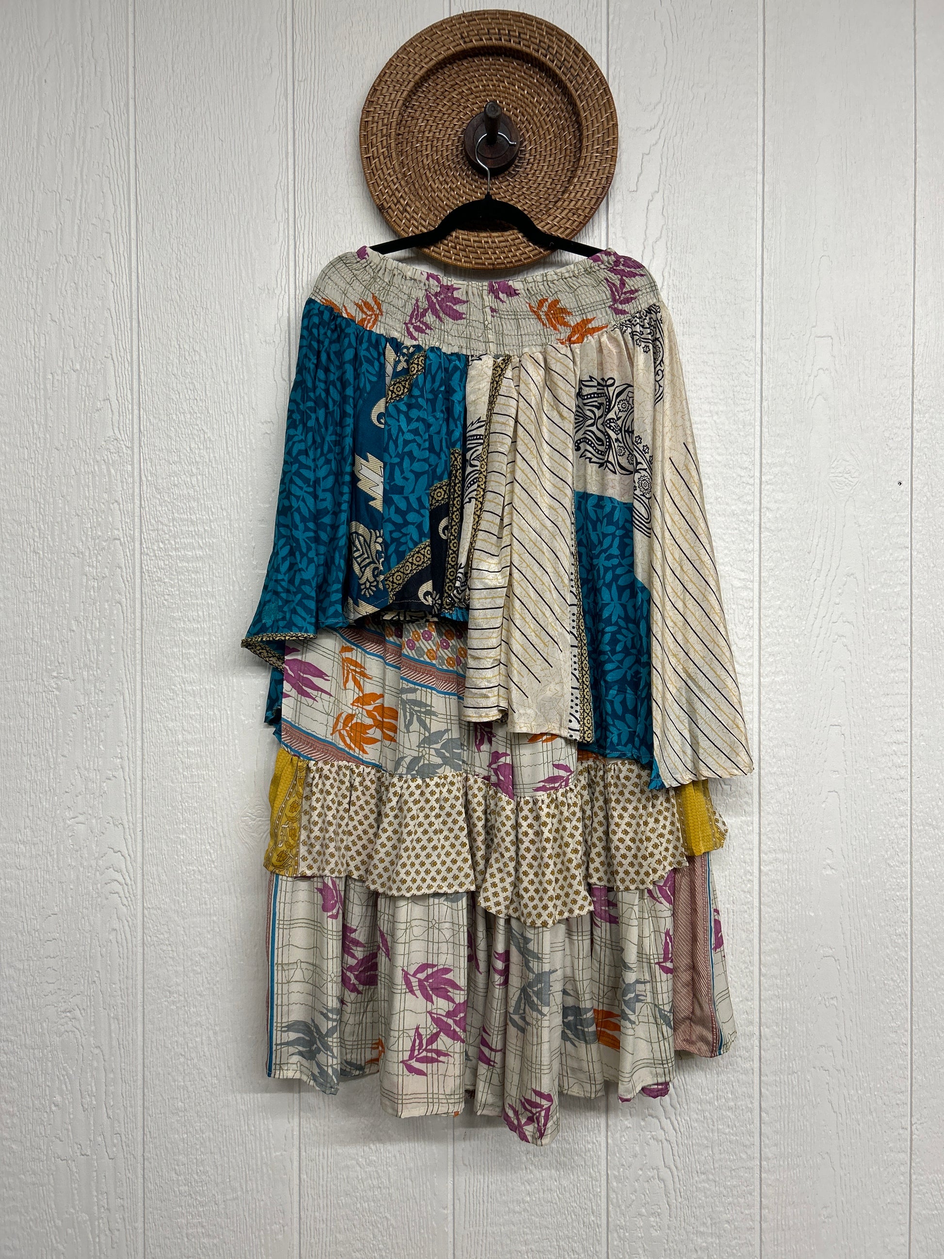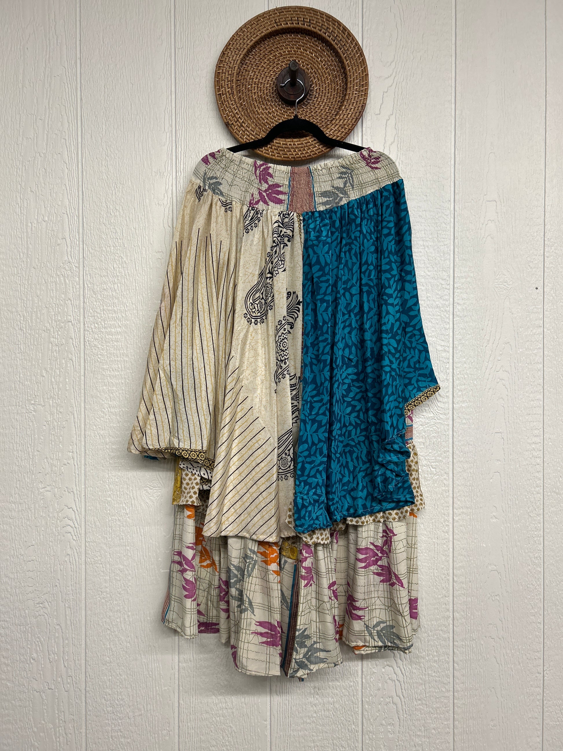 Crafted from vintage rasgulla sari these ethereal pants features stretchy waist, super wide legs, double tier hem and a skirt layer. these pants will make you want to dance! One size, recommended up to size 22/24 Crafted and sewn by families in a small village in Northern India providing work and a fair living. This product should be hand washed and line dried for longest life. For softness, fluff in the dryer on low heat after it has dried from hand washing. Disclosure: Our vintage styles have lived a full life before becoming the designs in our shop. Fabrics may have small threads or holes in the layers. Color inconsistency or small stains may be present. The saris are sewn together and extend the life of each design. Imperfections should be celebrated.