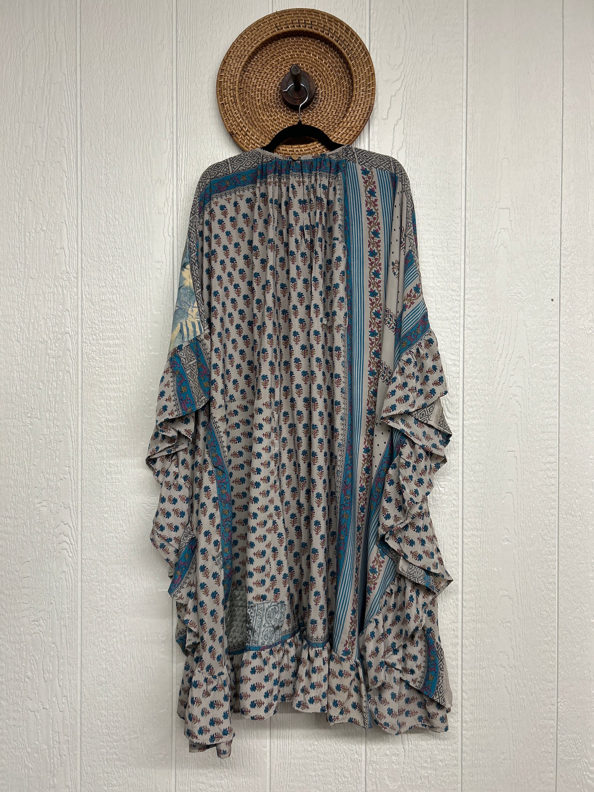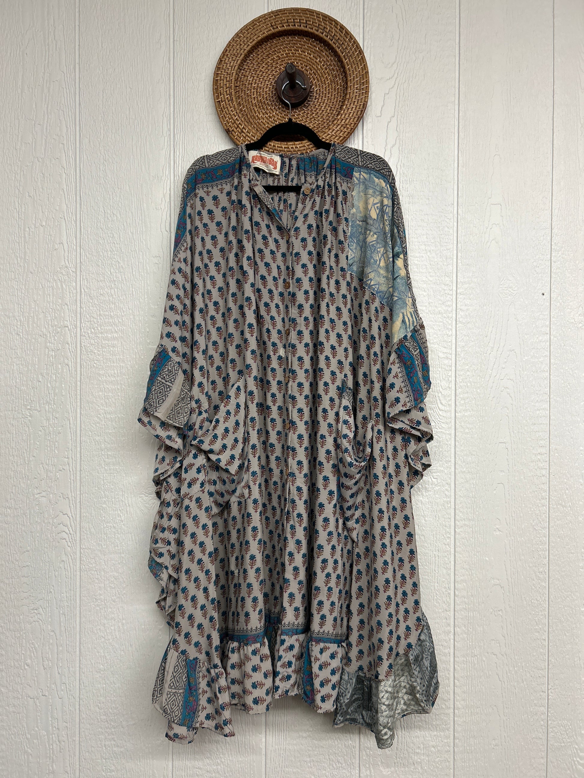 This dreamy muu is crafted from our ultra lux vintage rasgulla sari and features a button down placket and slouchy exterior pockets. Ruffles around the hem make this the ultimate rockstar layer that you can wear closed as a muu or open as a kimono!!