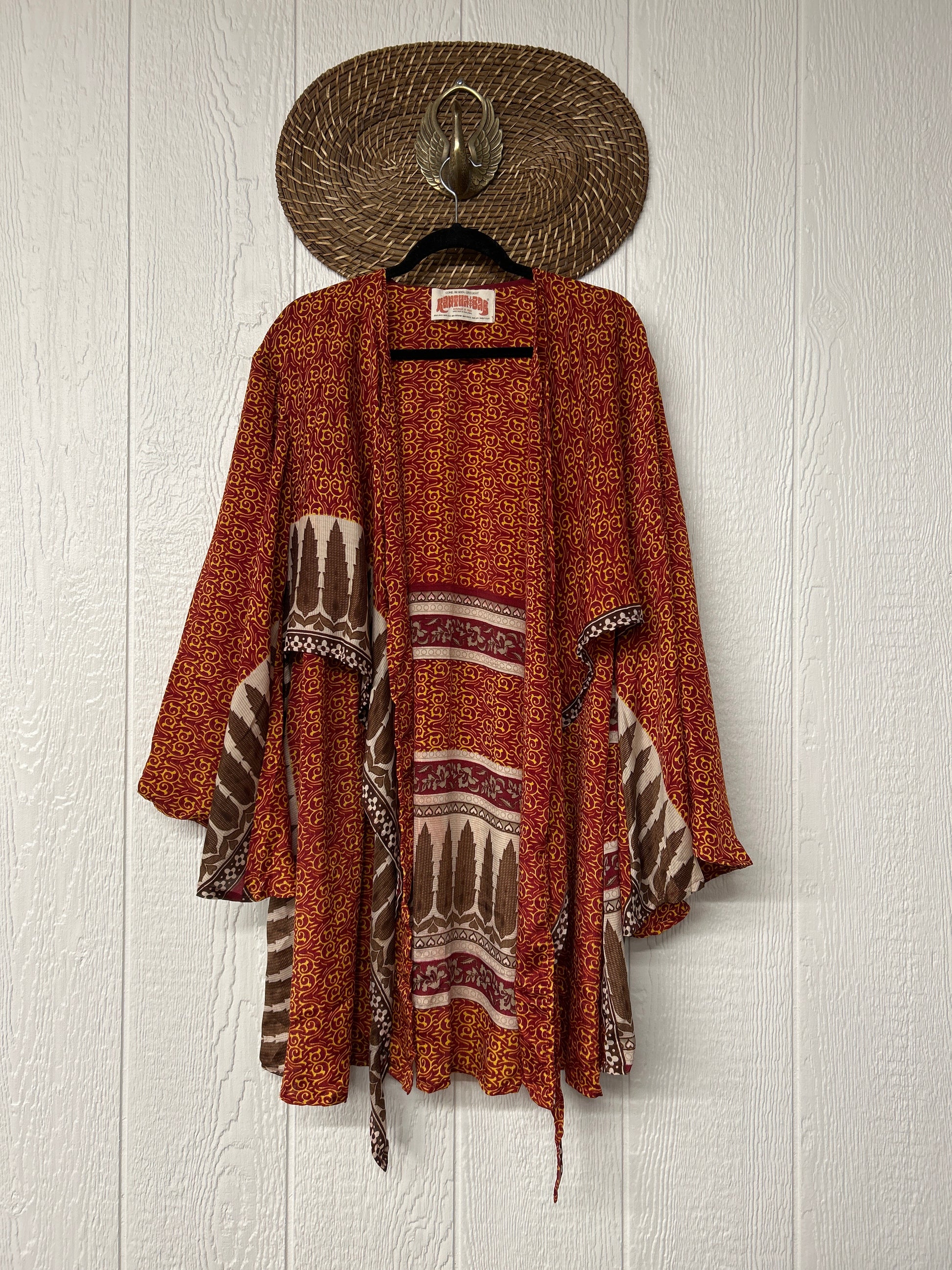 Turn heads in our Spellbound Kimono! Made from our ultra luxe vintage rasgulla sari, this groovy layering piece features exaggerated bell sleeves, a voluminous under layer and tie front shorter outer layer. Wear her open over your favorite band tee or closed with a slip under as a dress. New Shorter length!