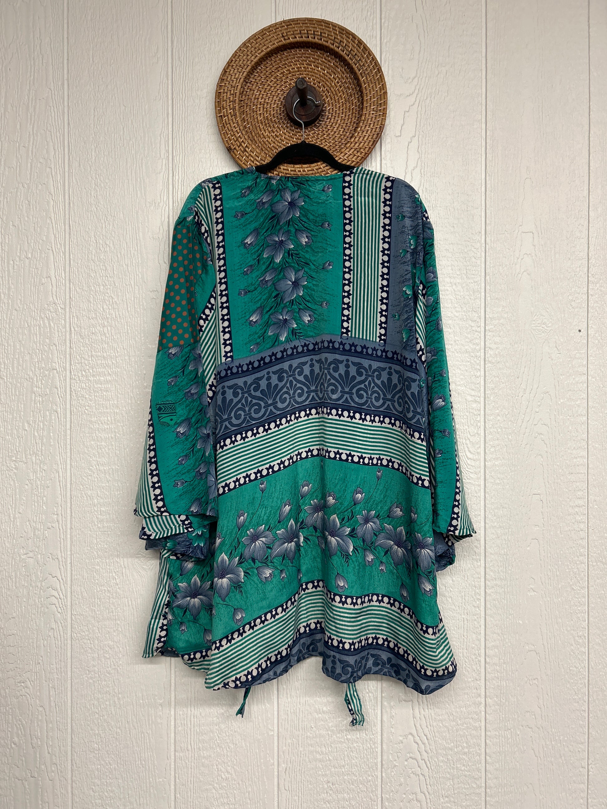 Turn heads in our Spellbound Kimono! Made from our ultra luxe vintage rasgulla sari, this groovy layering piece features exaggerated bell sleeves, a voluminous under layer and tie front shorter outer layer. Wear her open over your favorite band tee or closed with a slip under as a dress. New Shorter length!