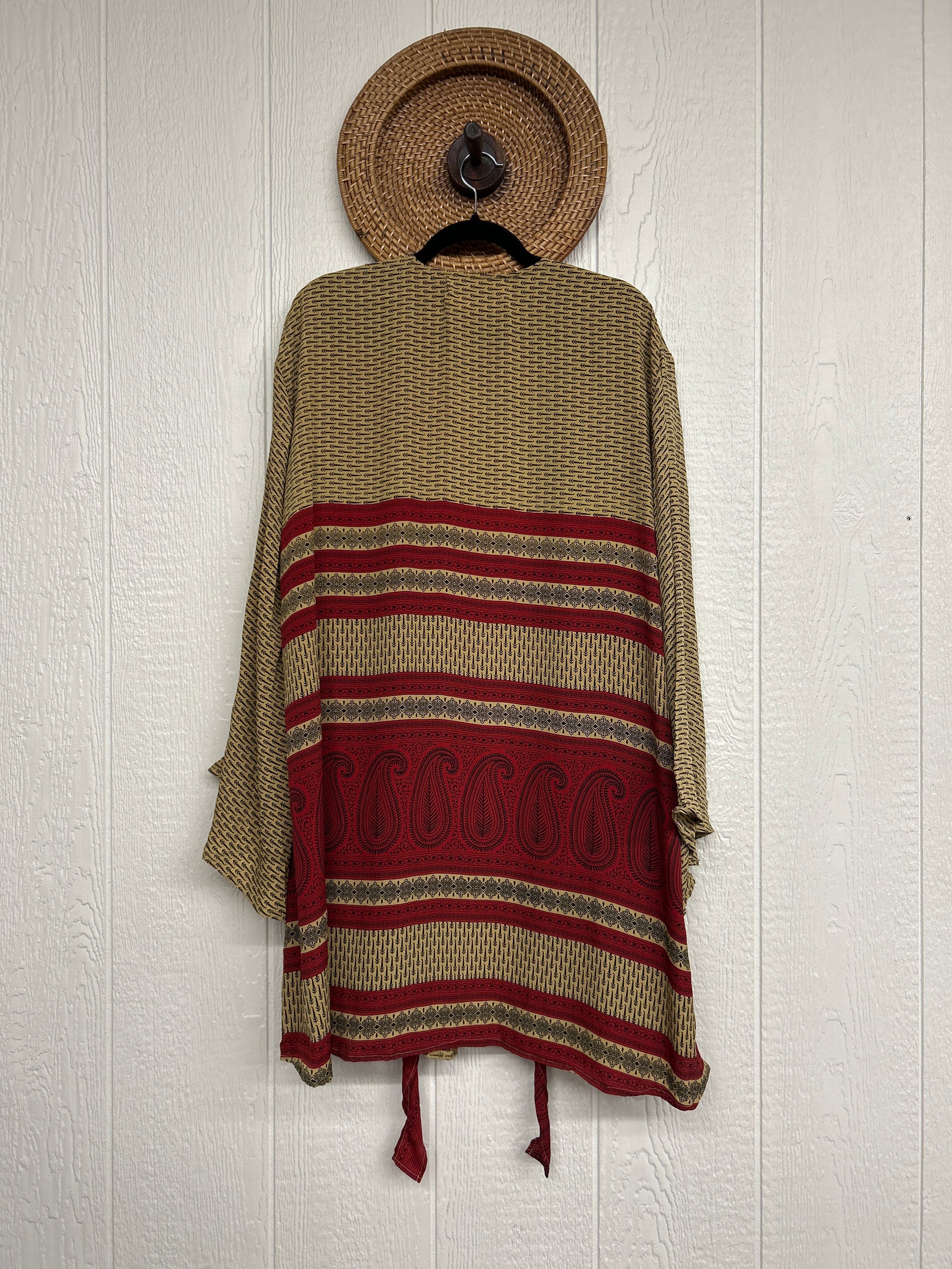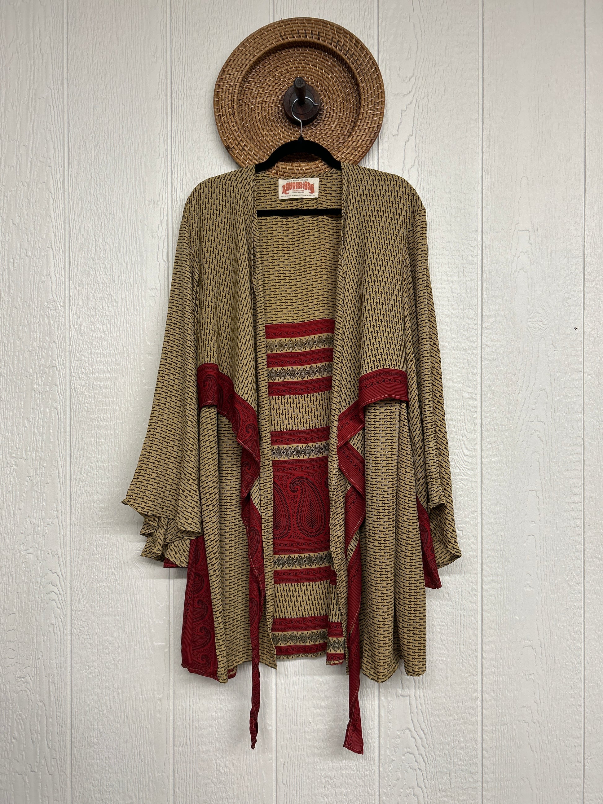 Turn heads in our Spellbound Kimono! Made from our ultra luxe vintage rasgulla sari, this groovy layering piece features exaggerated bell sleeves, a voluminous under layer and tie front shorter outer layer. Wear her open over your favorite band tee or closed with a slip under as a dress. New Shorter length!