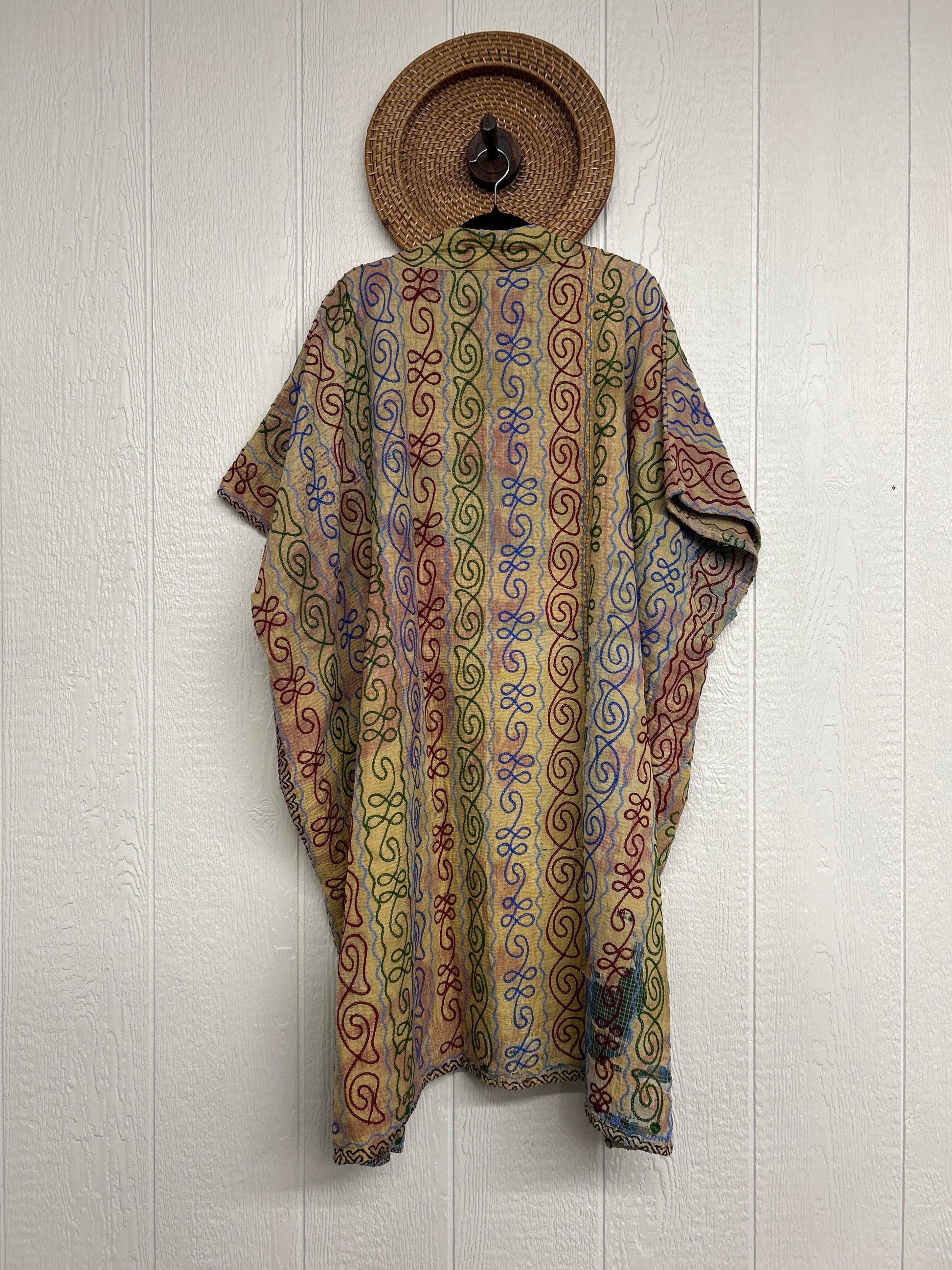 Crafted from hand embroidered fine kantha features a v neckline and interior pockets and side slits for extra dimension.