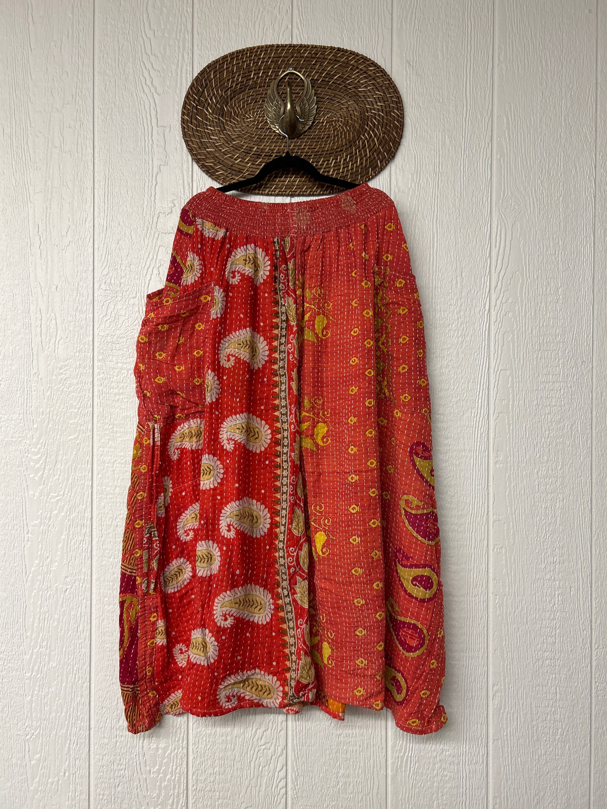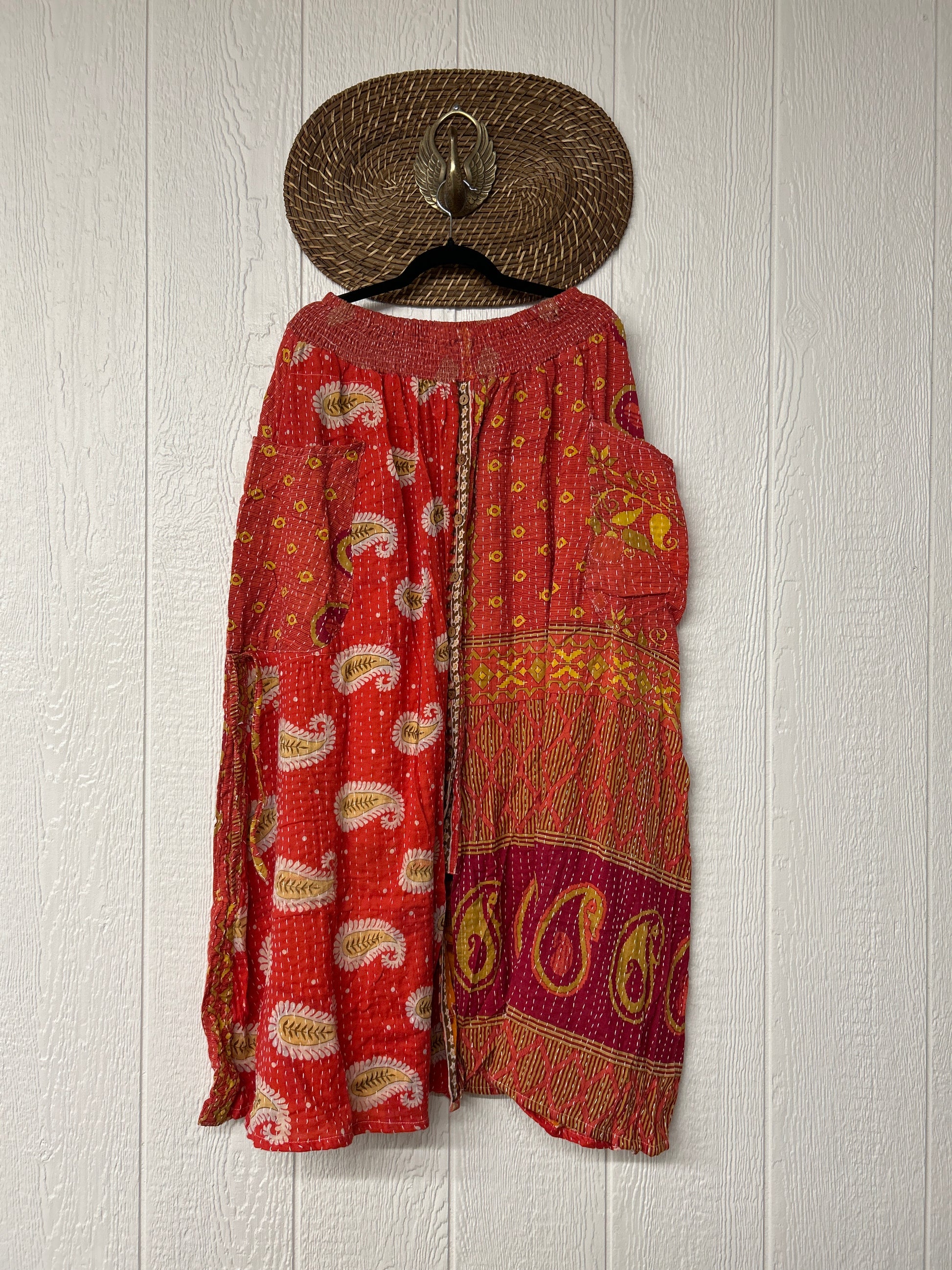 Crafted from kantha stitched vintage cotton sari this absolute dream features slouchy side pockets with a butterfly drawstring to cinch the sides, a button front skirt and a stretchy free size waist.