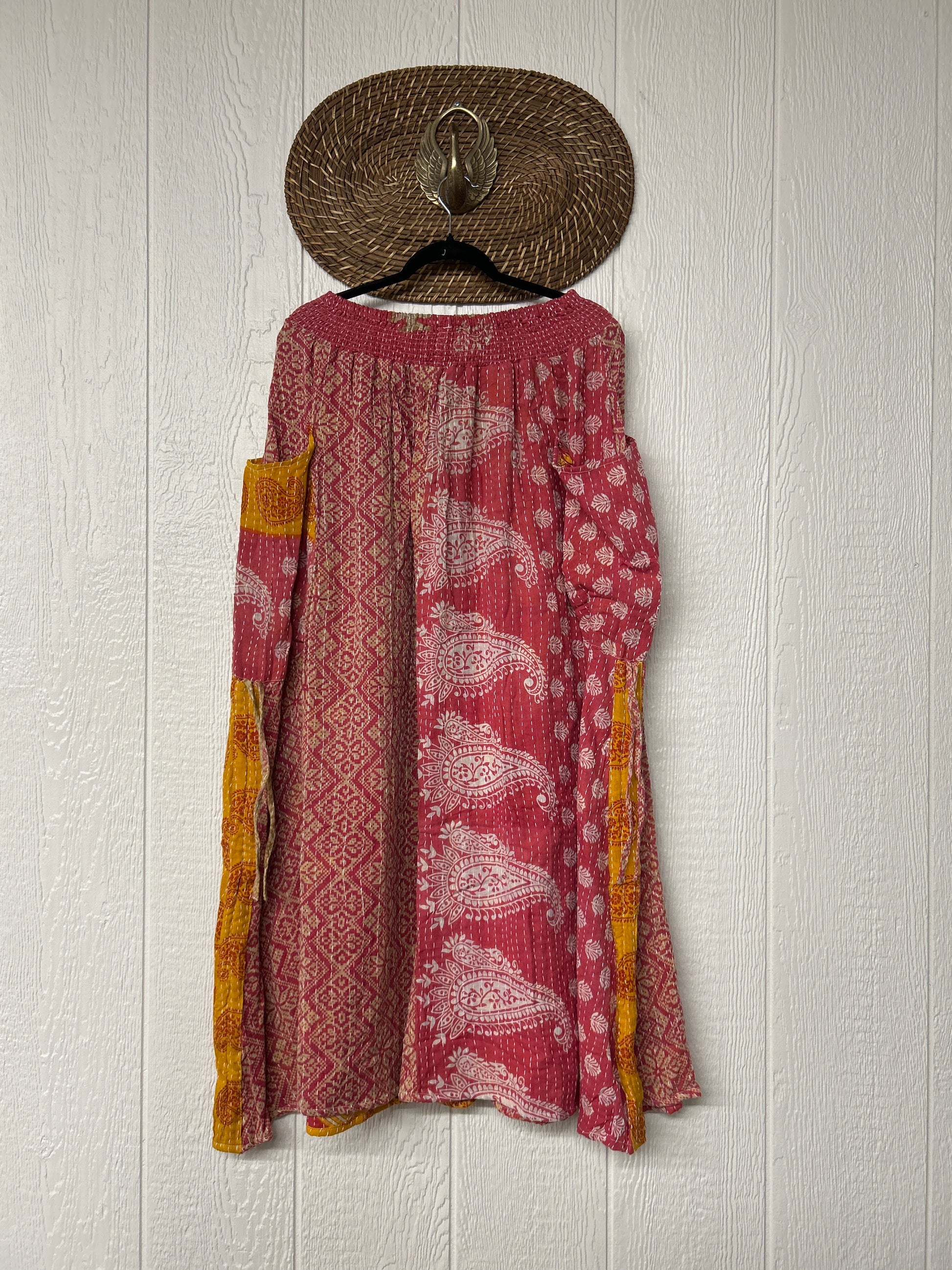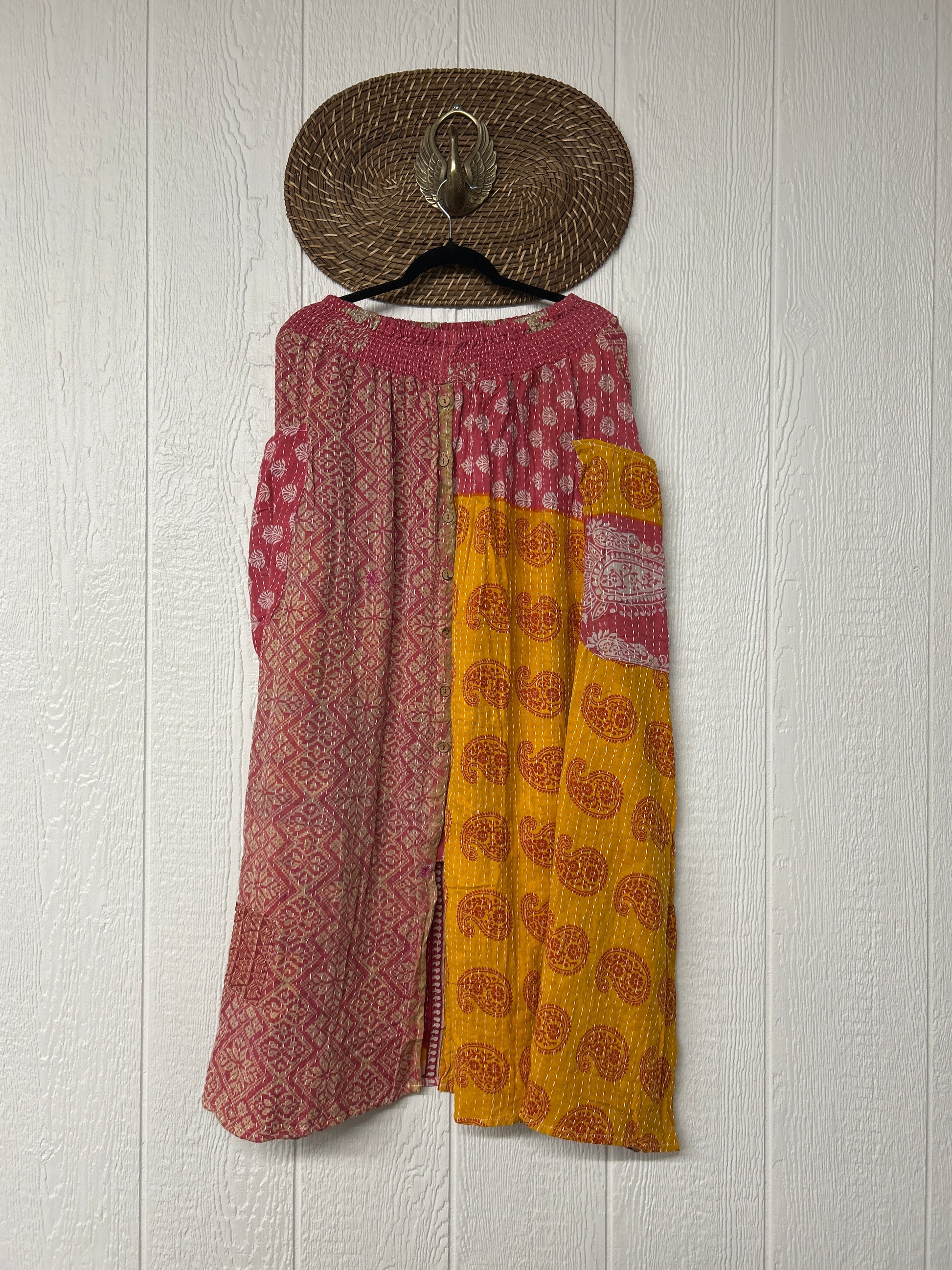 Crafted from kantha stitched vintage cotton sari this absolute dream features slouchy side pockets with a butterfly drawstring to cinch the sides, a button front skirt and a stretchy free size waist.