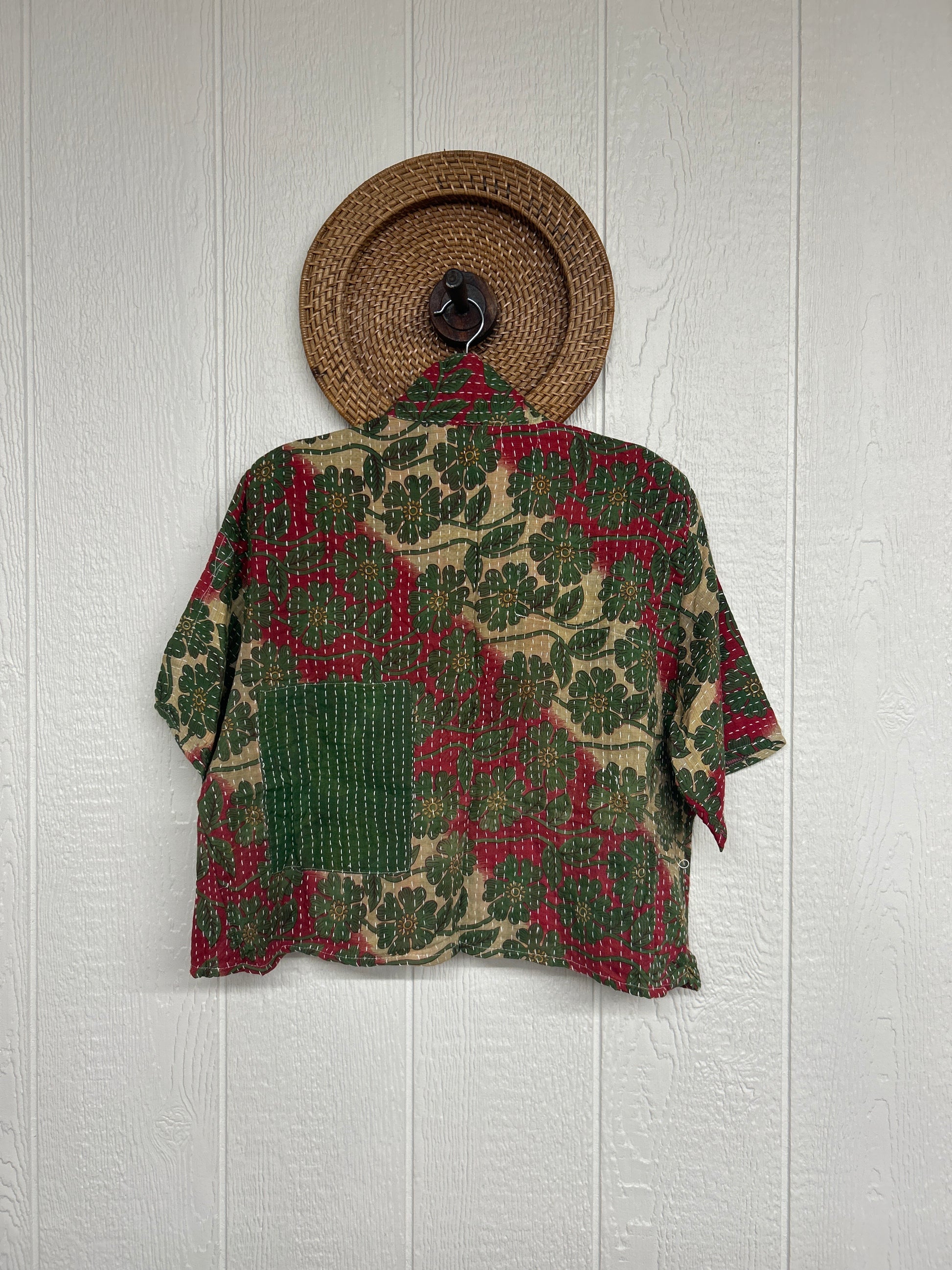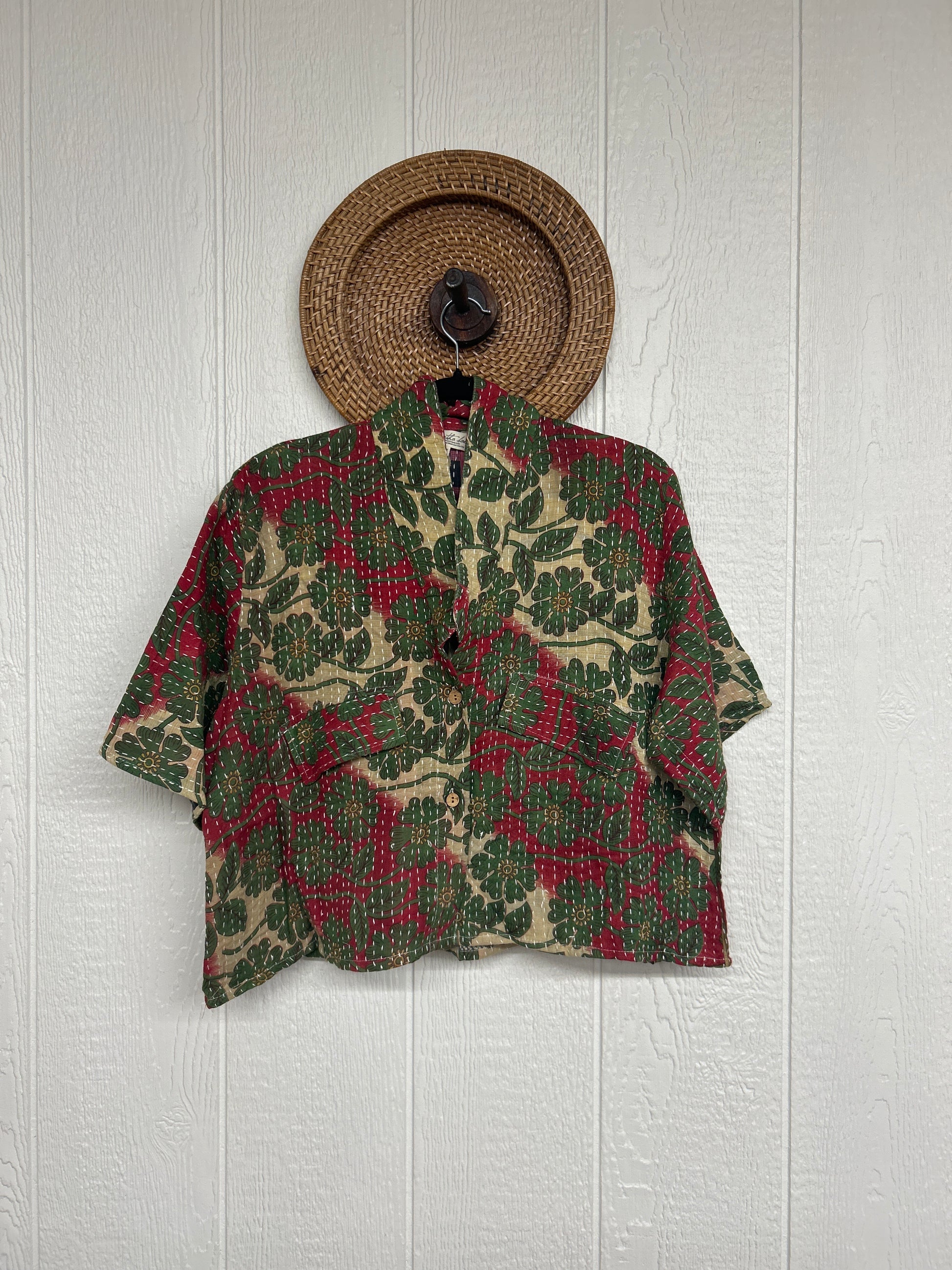 The Clarity Crop is the cropped camp shirt of your dreams! Crafted from our ultra lux kantha stitched vintage cotton sari the Clarity crop features interior pockets, a button down placket, collar and trendy cropped boxy silhouette.