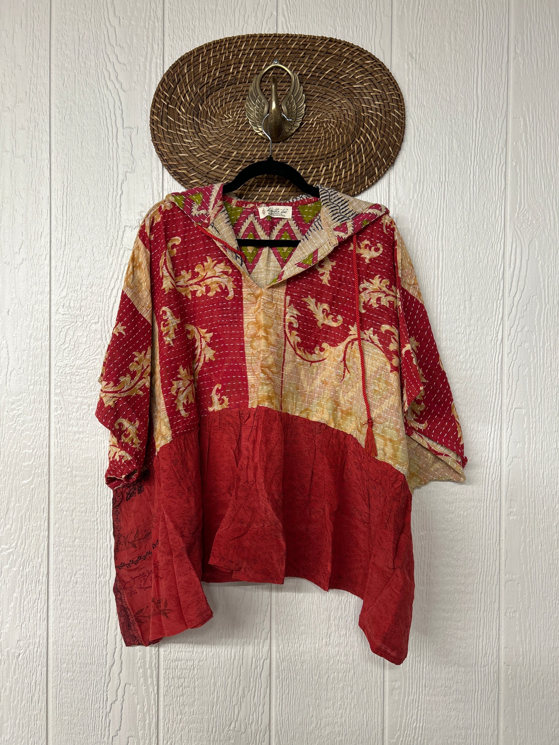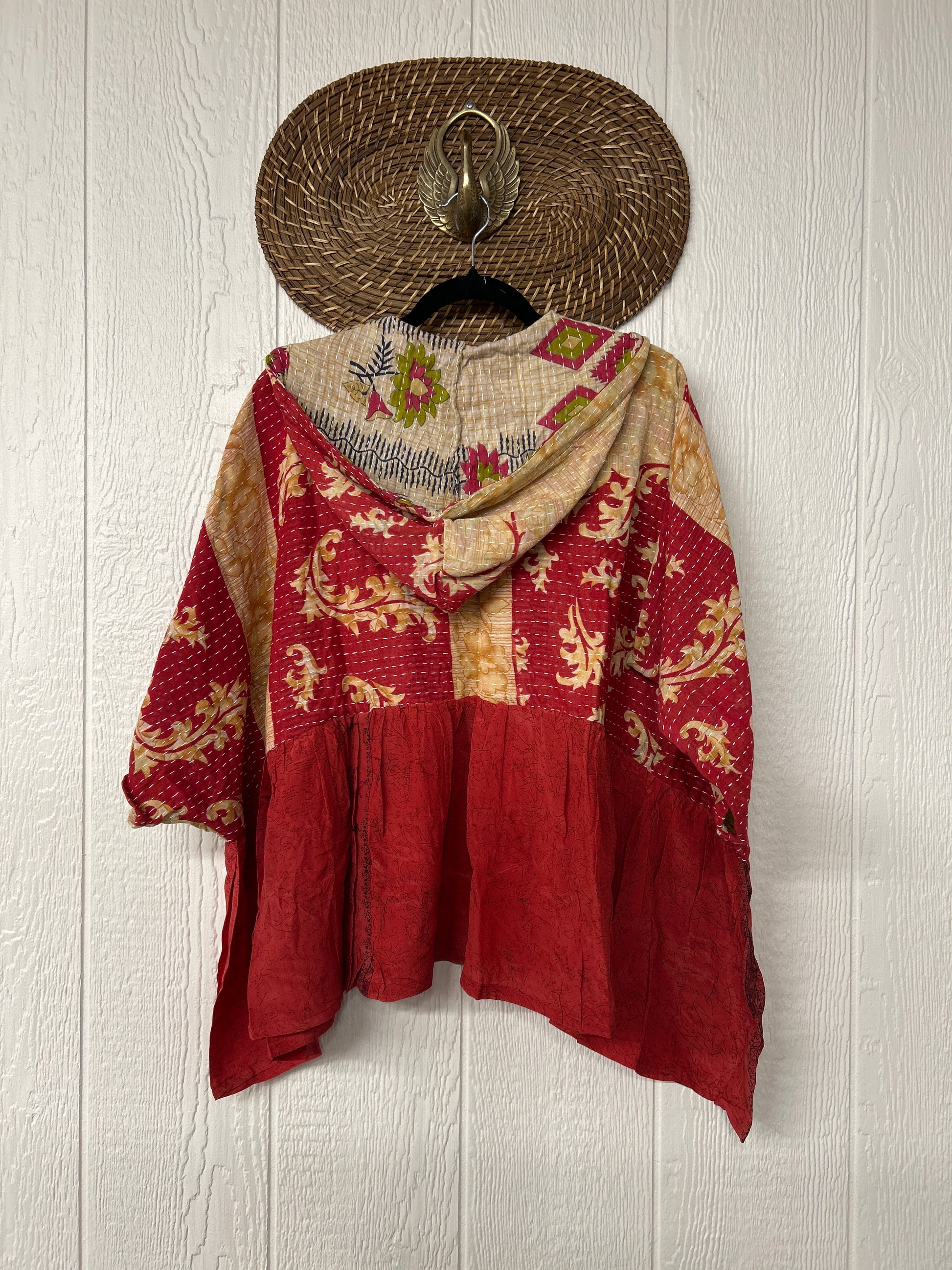 Your favorite throw on and go piece is made out of our vintage kantha embroidered sari with a crepe sari flounce. This poncho like silhouette is a flowy floaty dream.
