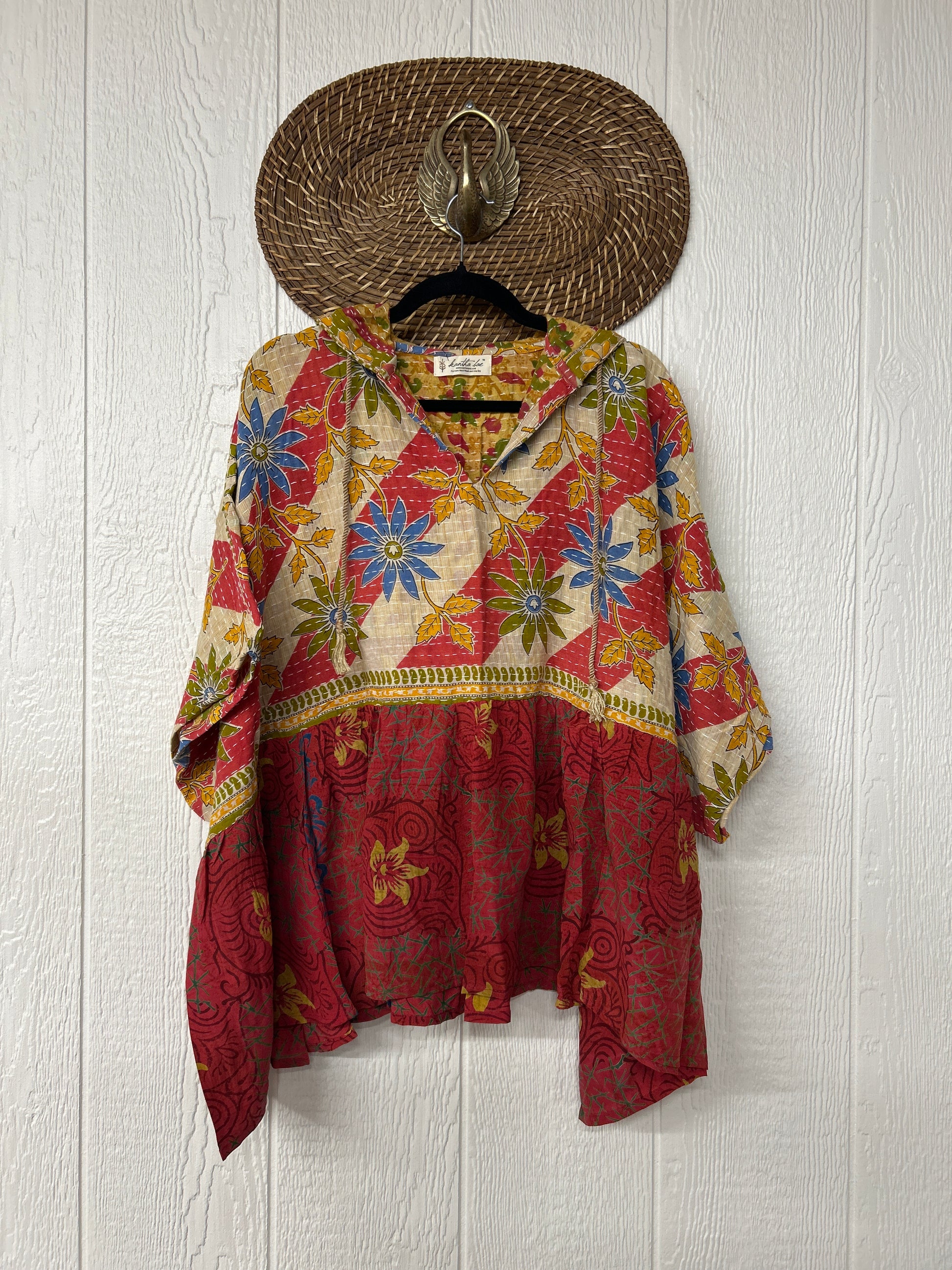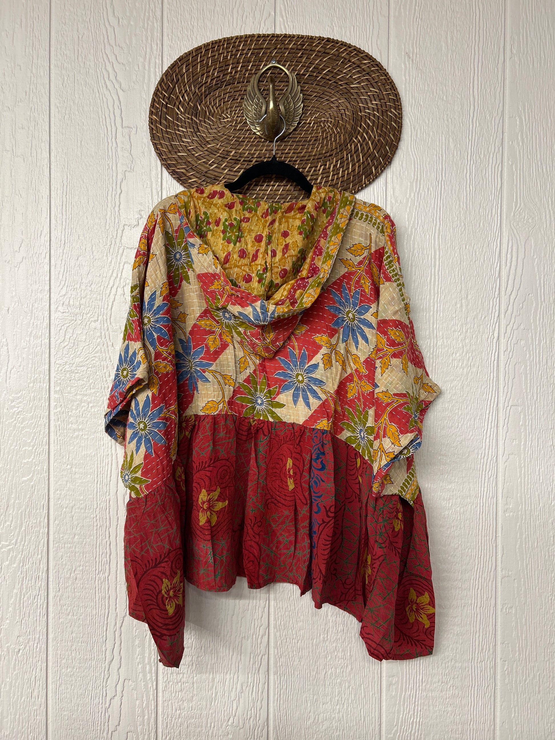 Your favorite throw on and go piece is made out of our vintage kantha embroidered sari with a crepe sari flounce. This poncho like silhouette is a flowy floaty dream.