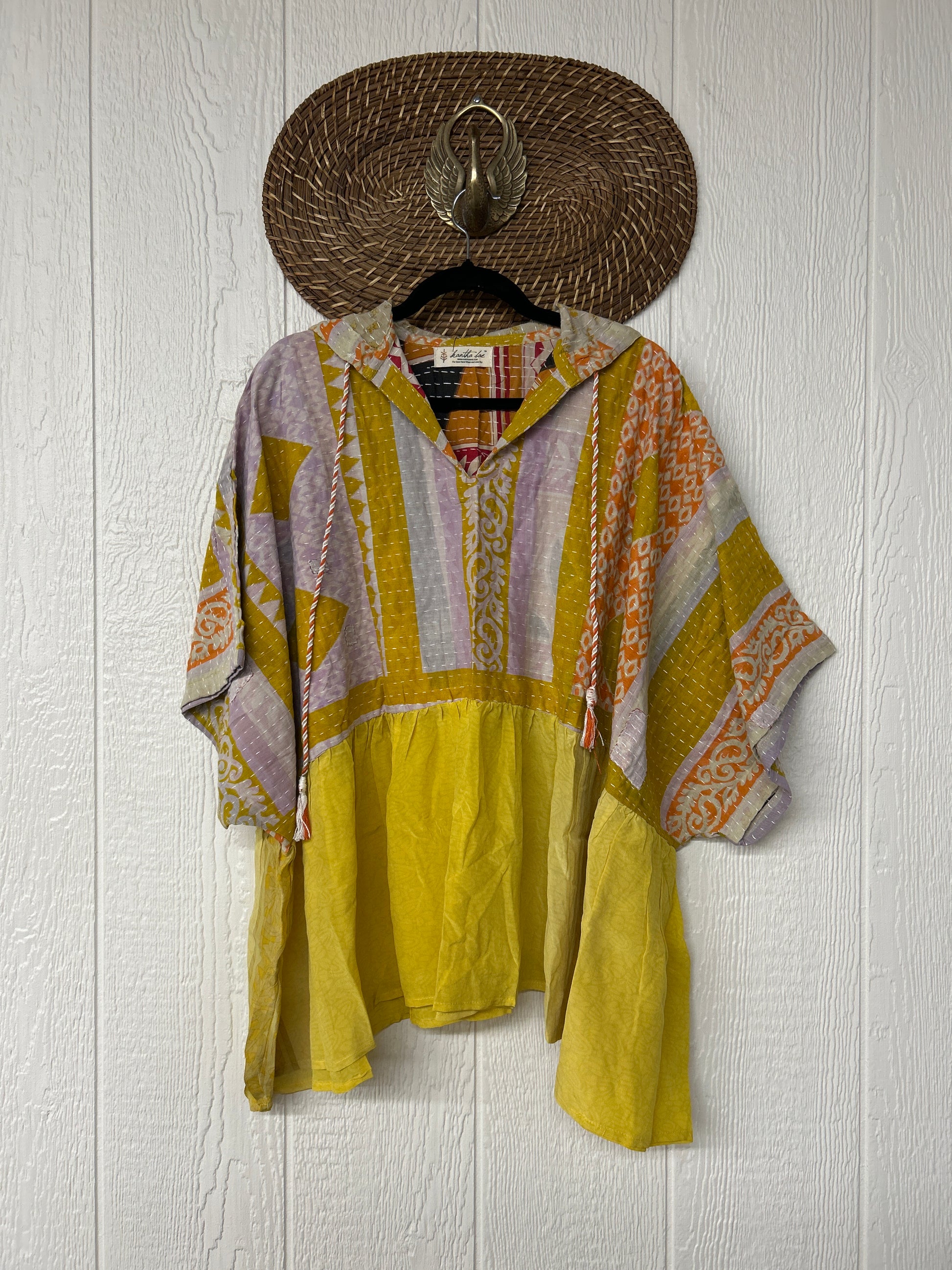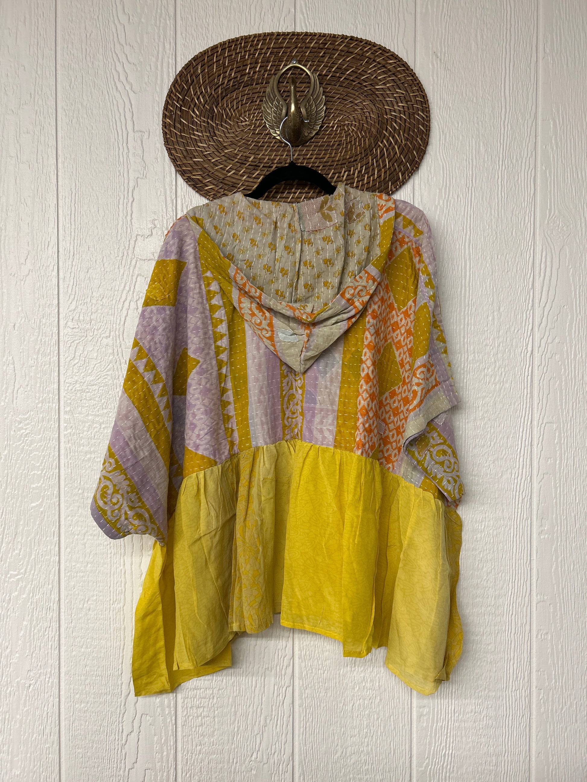 Your favorite throw on and go piece is made out of our vintage kantha embroidered sari with a crepe sari flounce. This poncho like silhouette is a flowy floaty dream.