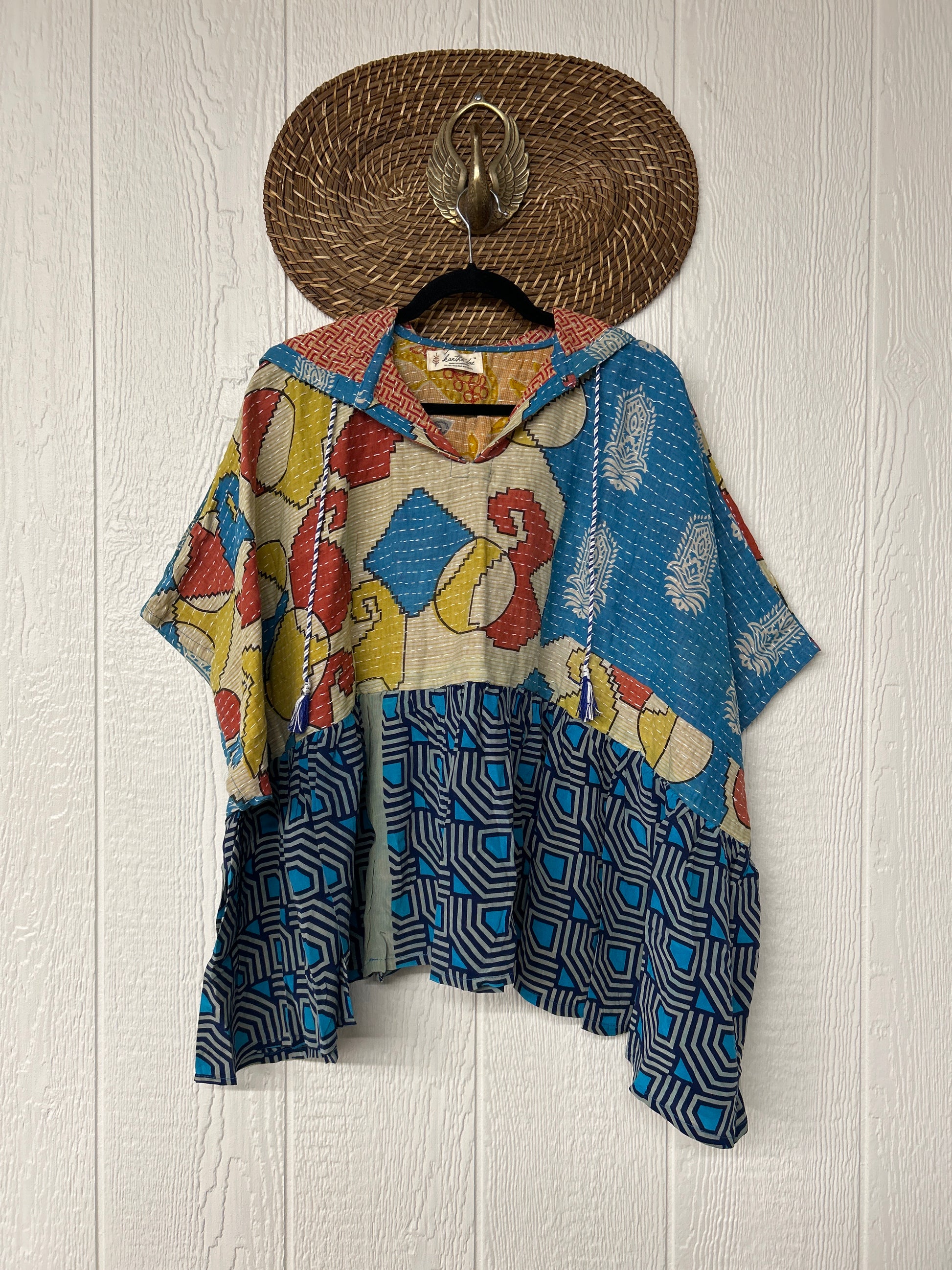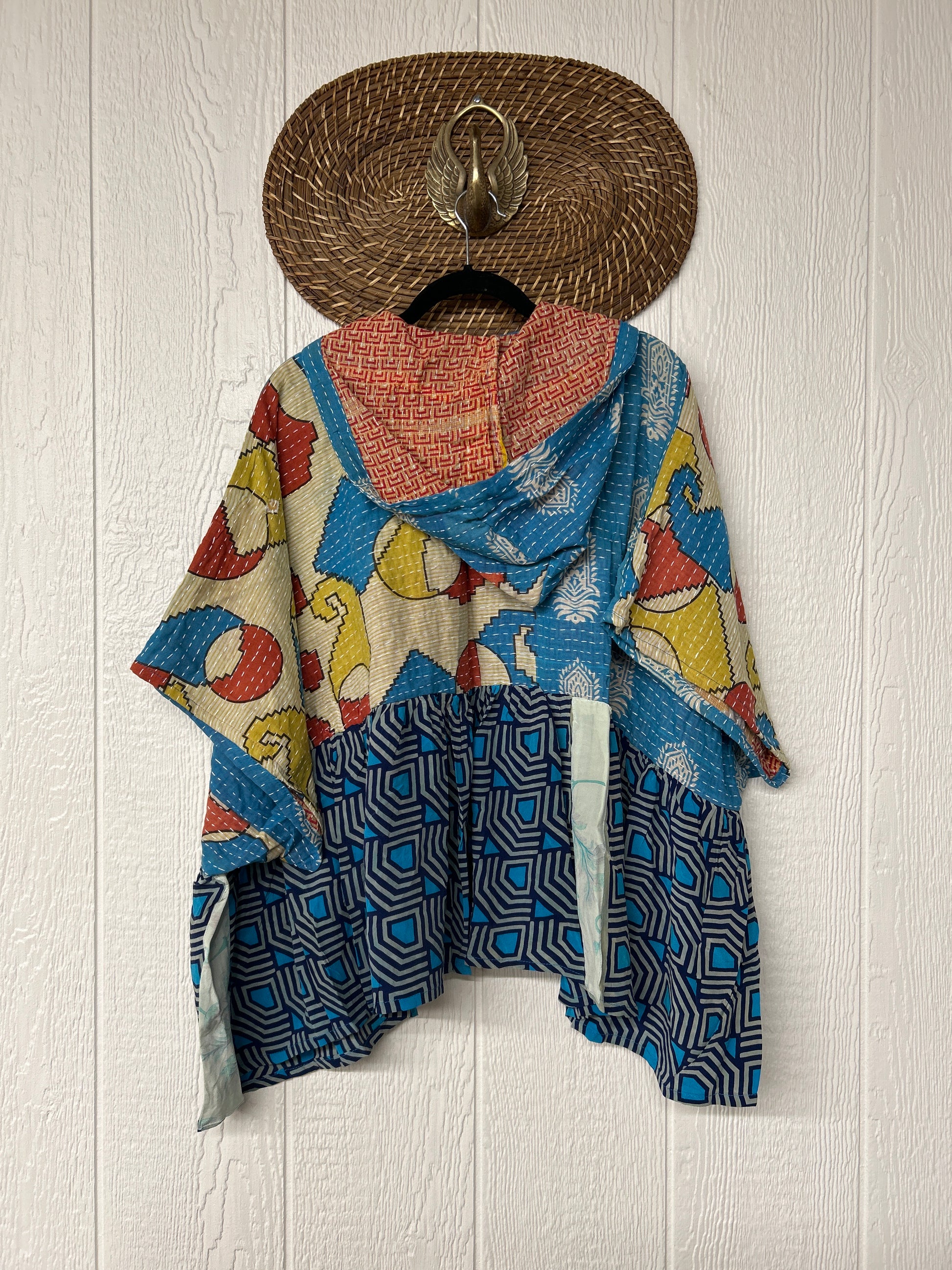 Your favorite throw on and go piece is made out of our vintage kantha embroidered sari with a crepe sari flounce. This poncho like silhouette is a flowy floaty dream.