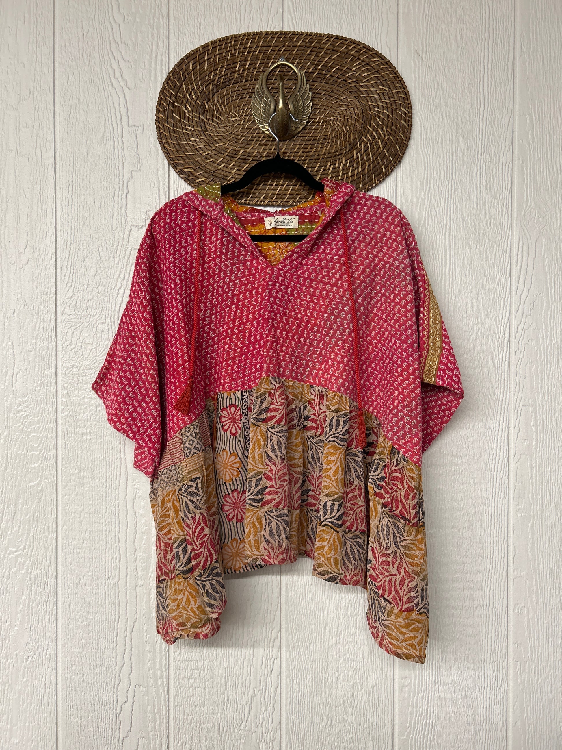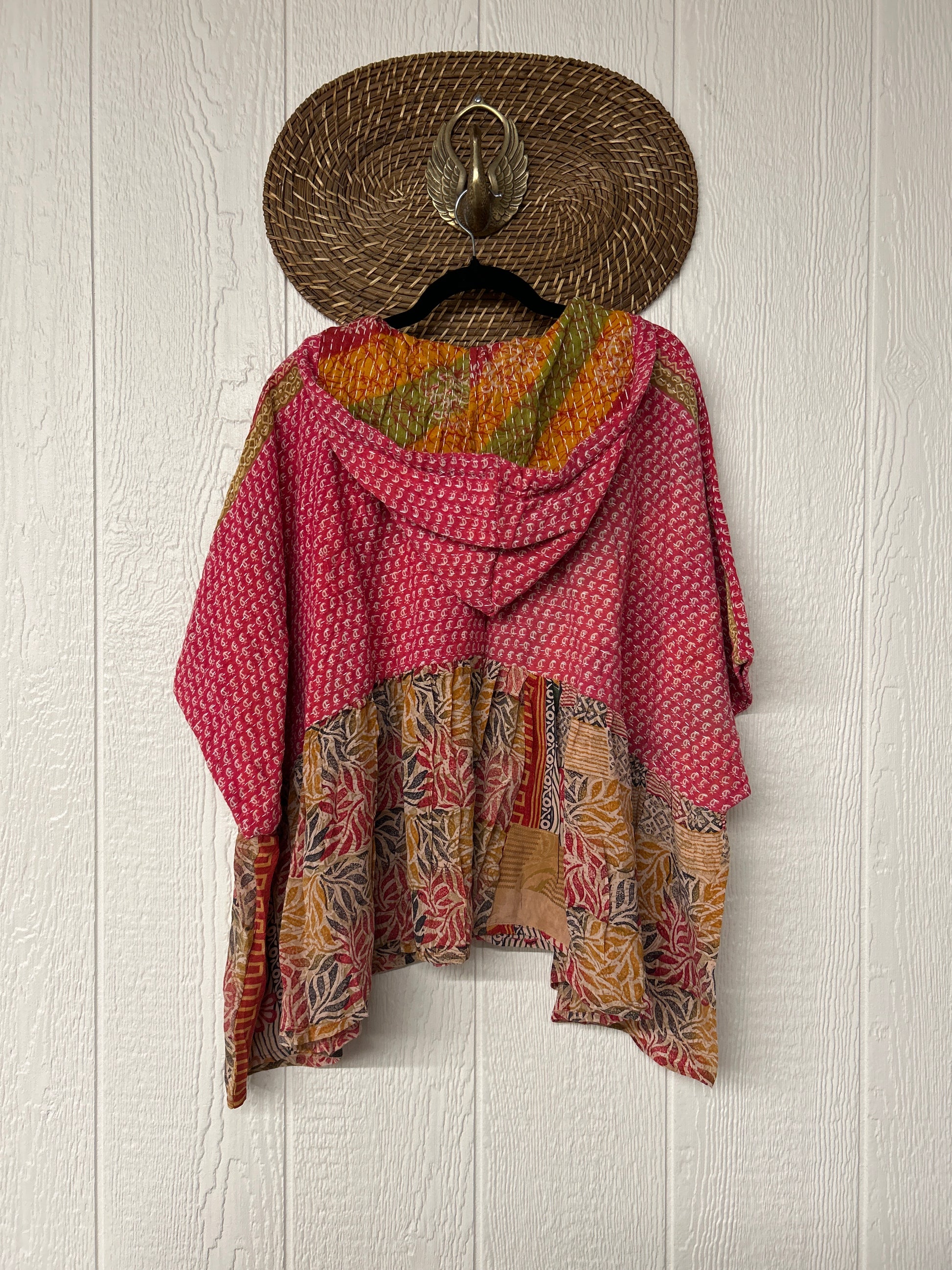 Your favorite throw on and go piece is made out of our vintage kantha embroidered sari with a crepe sari flounce. This poncho like silhouette is a flowy floaty dream.