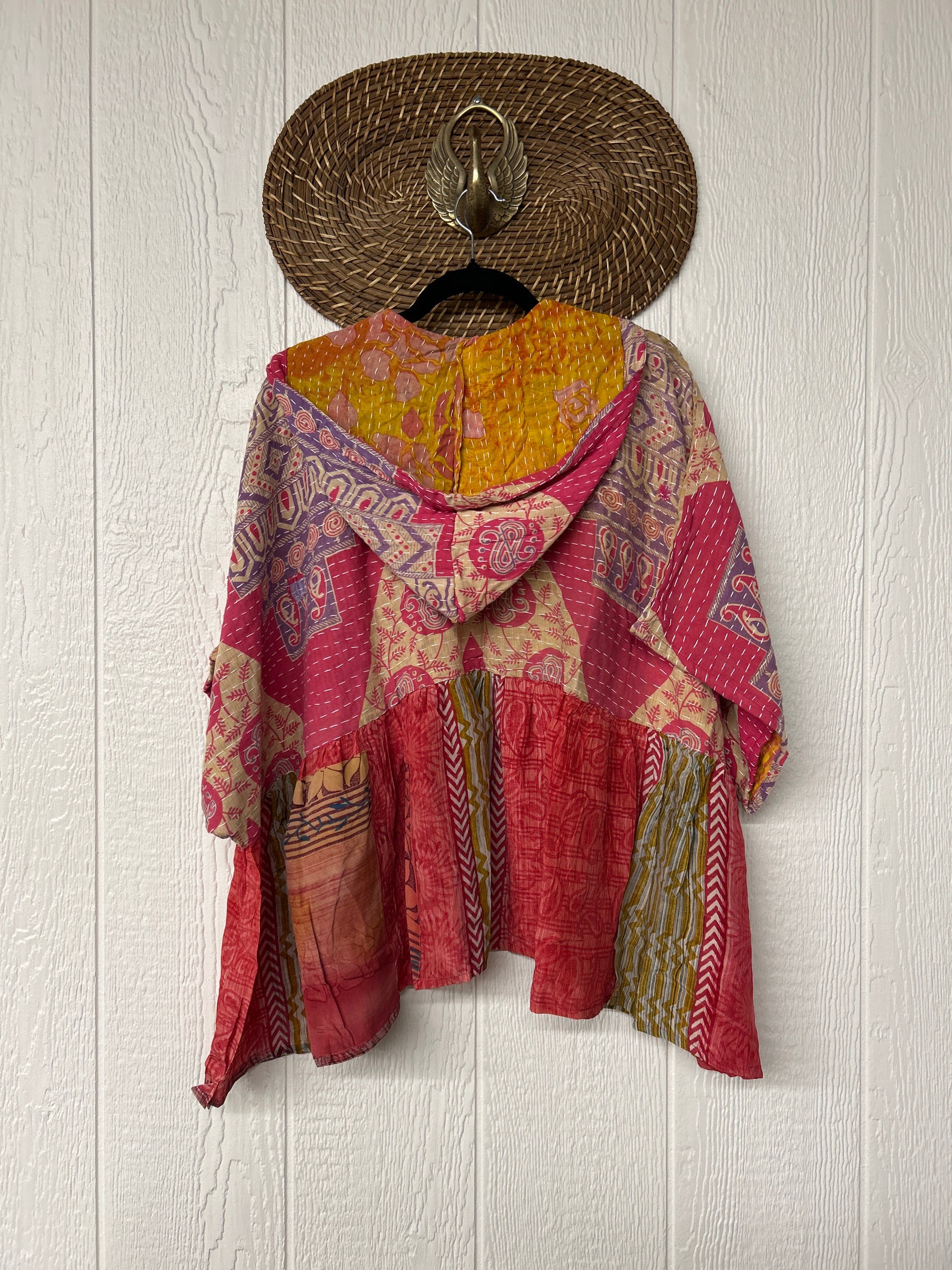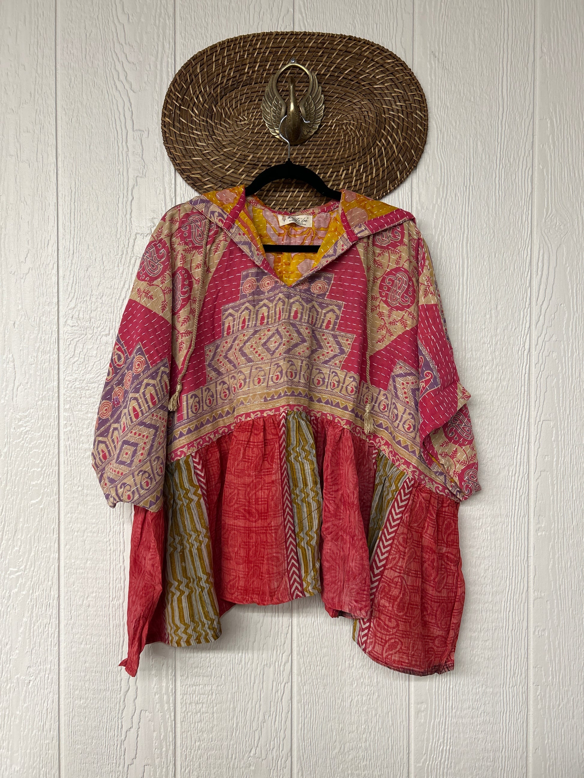Your favorite throw on and go piece is made out of our vintage kantha embroidered sari with a crepe sari flounce. This poncho like silhouette is a flowy floaty dream.