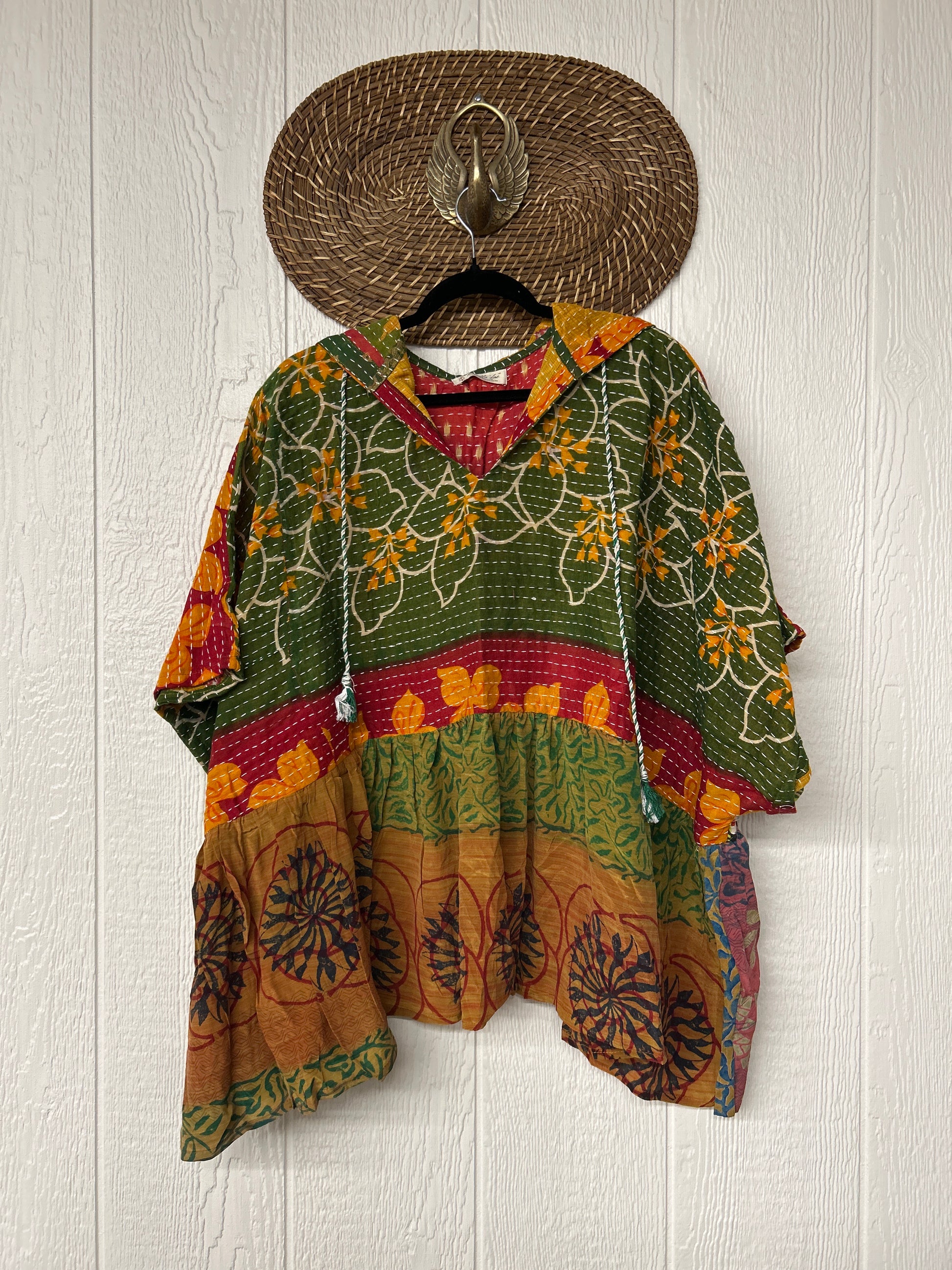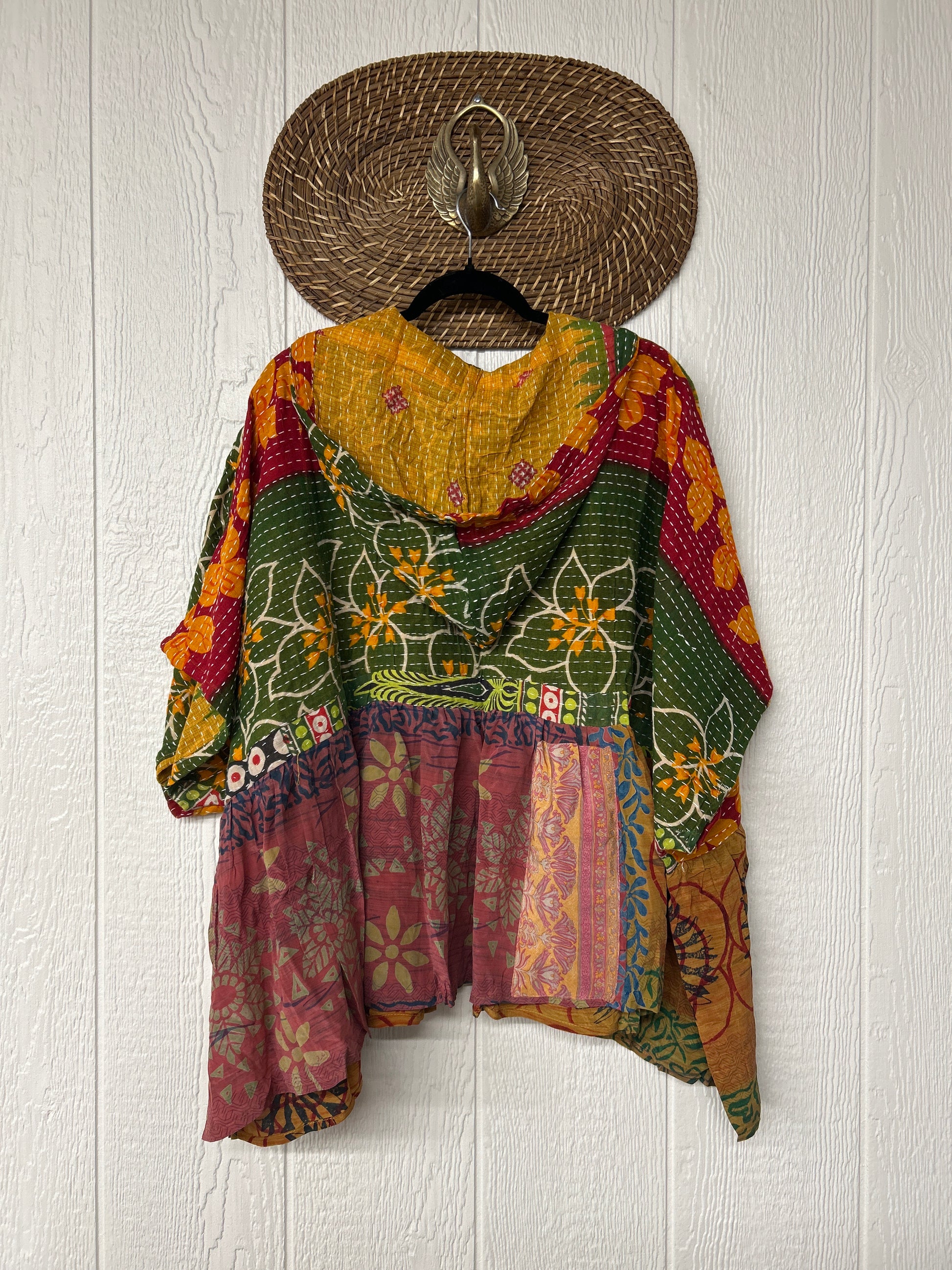 Your favorite throw on and go piece is made out of our vintage kantha embroidered sari with a crepe sari flounce. This poncho like silhouette is a flowy floaty dream.