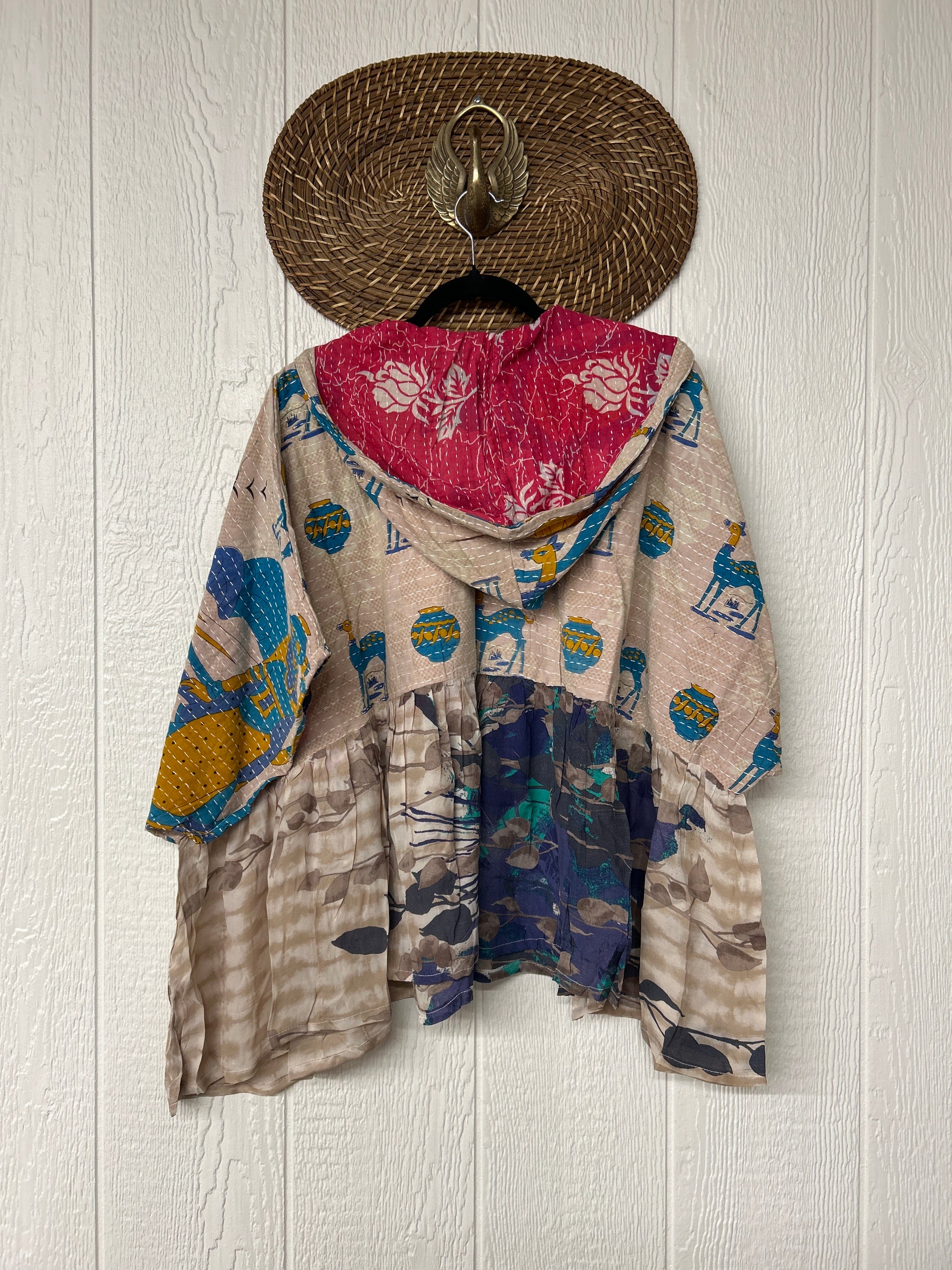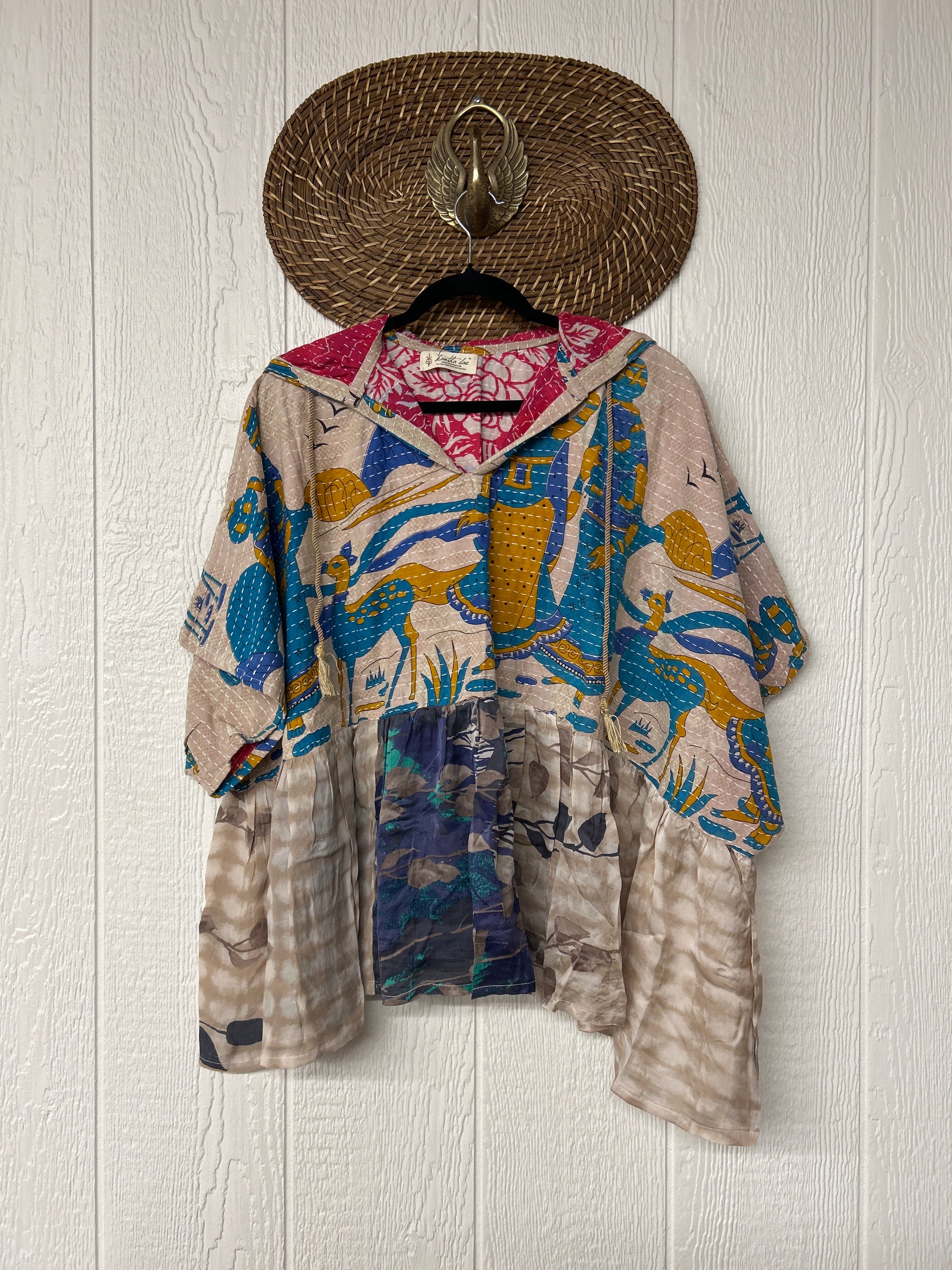 Your favorite throw on and go piece is made out of our vintage kantha embroidered sari with a crepe sari flounce. This poncho like silhouette is a flowy floaty dream.
