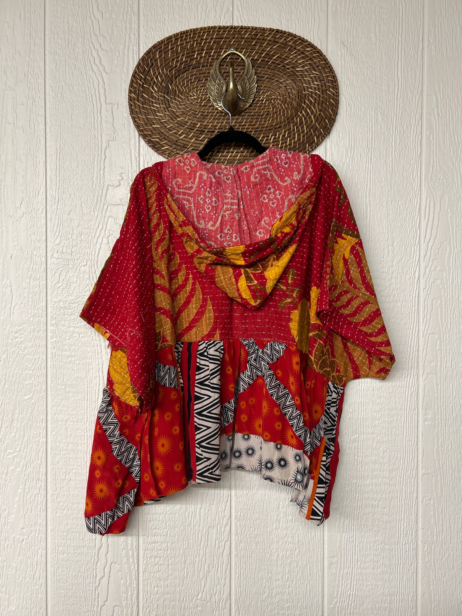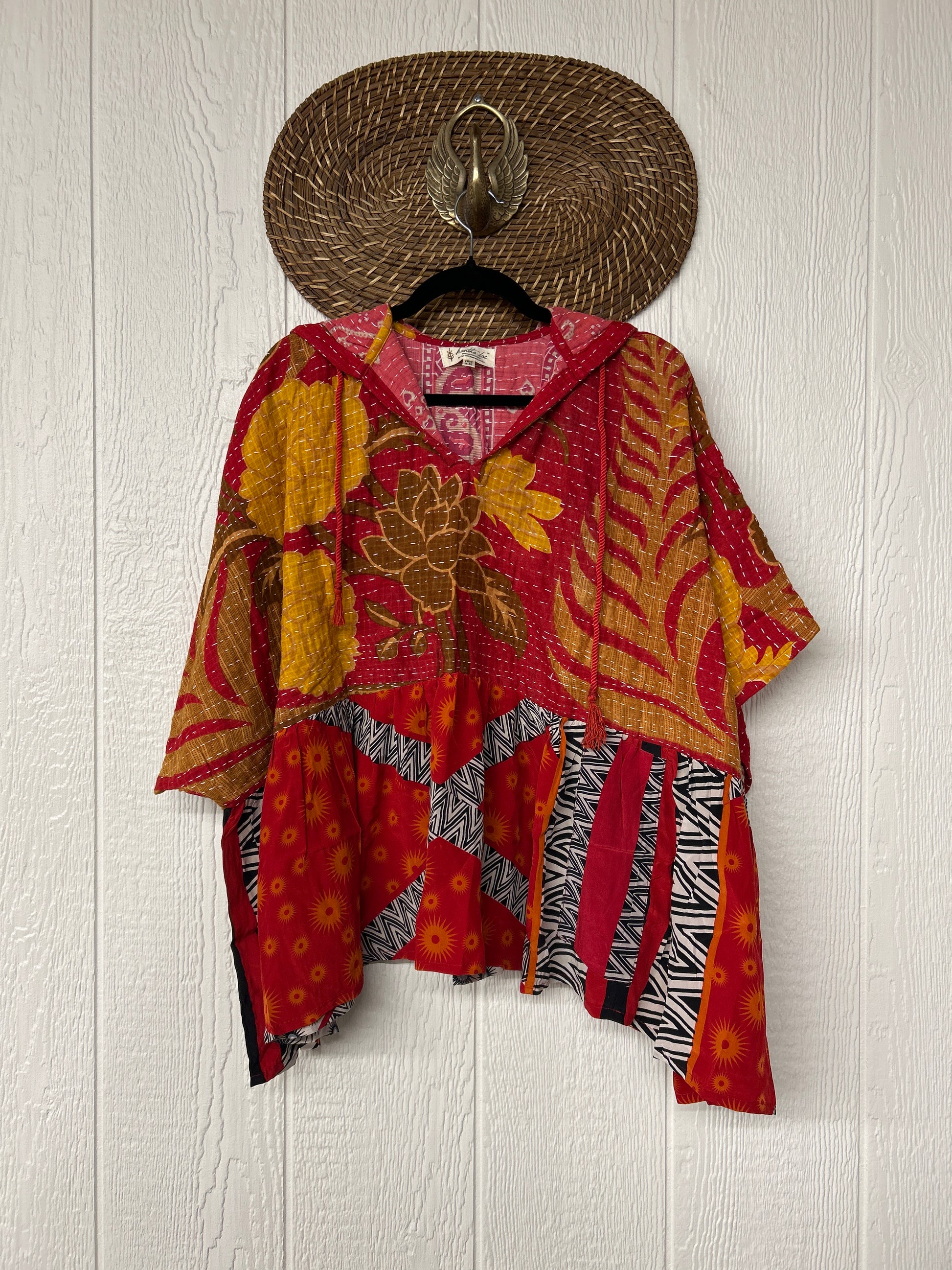 Your favorite throw on and go piece is made out of our vintage kantha embroidered sari with a crepe sari flounce. This poncho like silhouette is a flowy floaty dream.