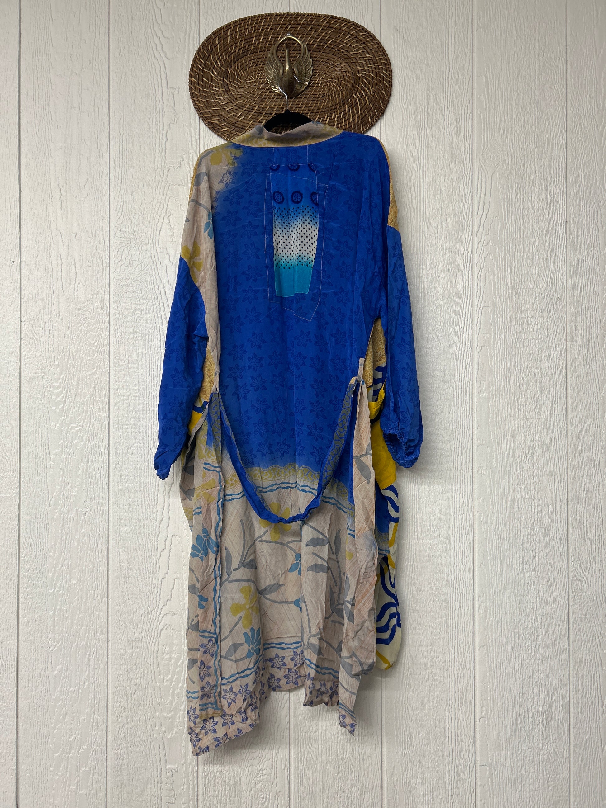 Fabrics may have small threads or holes in the layers. Color inconsistency or small stains may be present. The saris are sewn together and extend the life of each design. Imperfections should be celebrated.