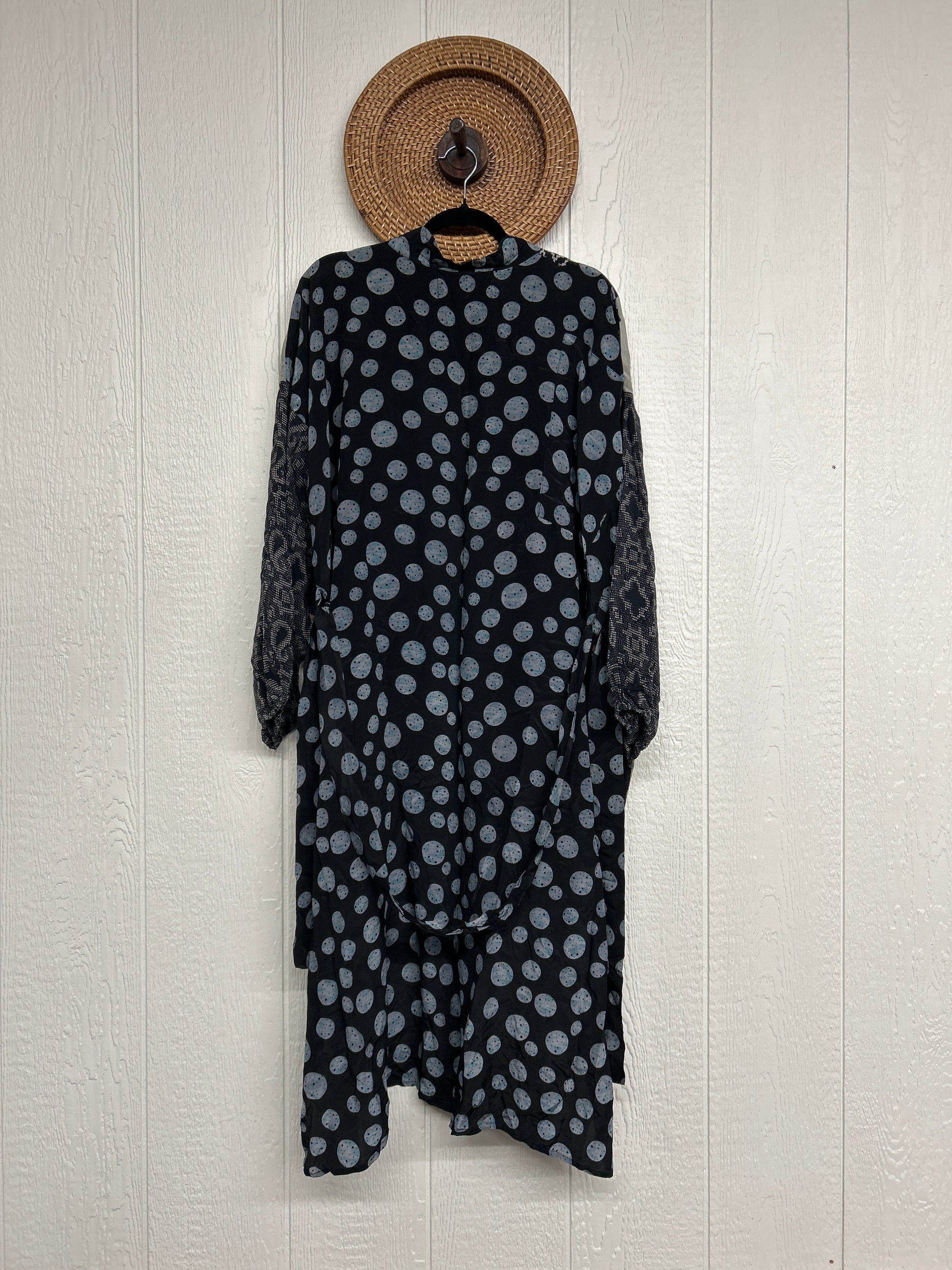 Crepe Dusters are beautiful, flowy, midi-length kimonos made from our ultra lux vintage crepe sari. They feature balloon sleeves with elastic at the wrist, 2 slouchy pockets, and a sash. They are one of our favorite layering pieces EVER.