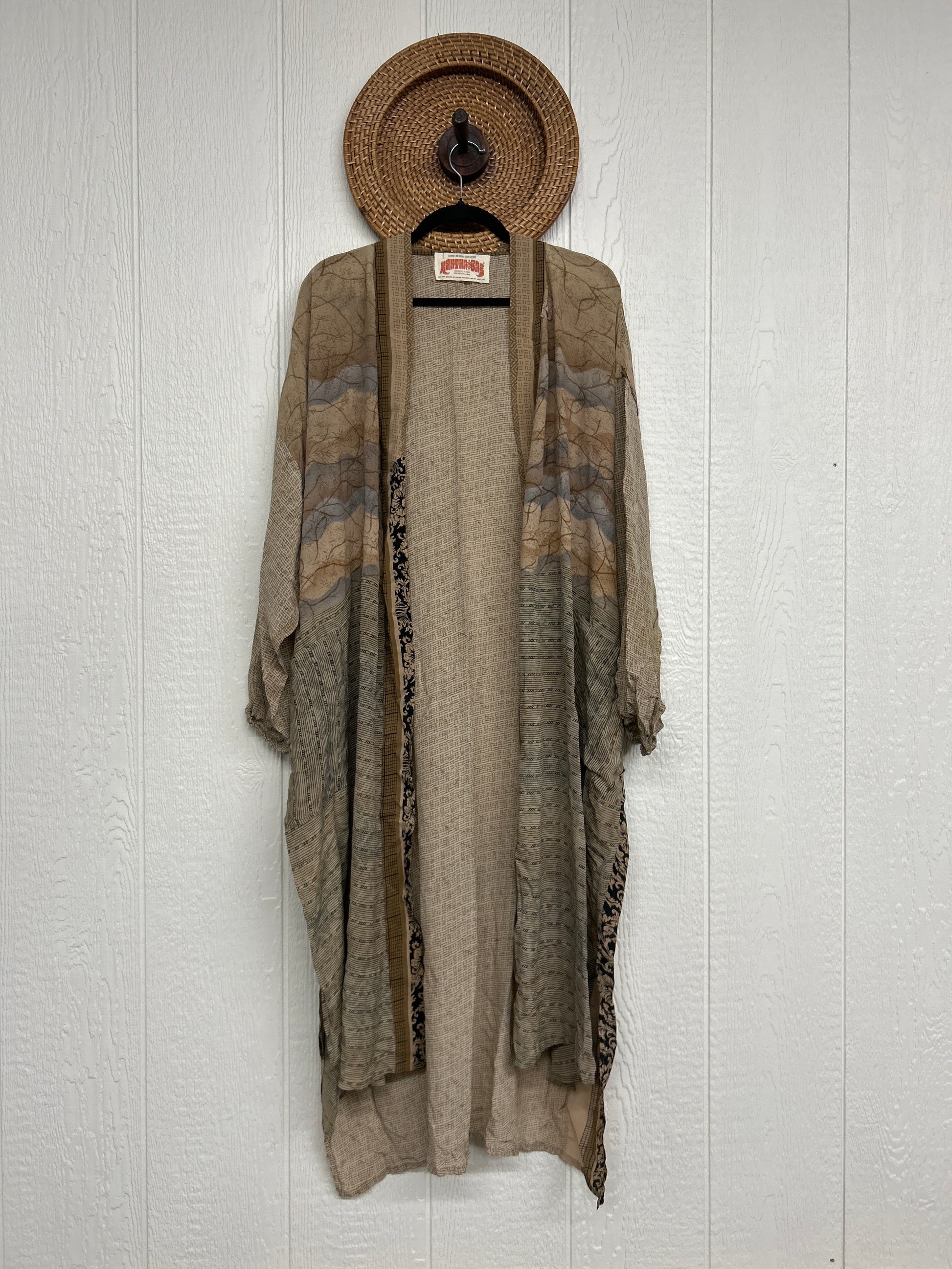 Crepe Dusters are beautiful, flowy, midi-length kimonos made from our ultra lux vintage crepe sari. They feature balloon sleeves with elastic at the wrist, 2 slouchy pockets, and a sash. They are one of our favorite layering pieces EVER.
