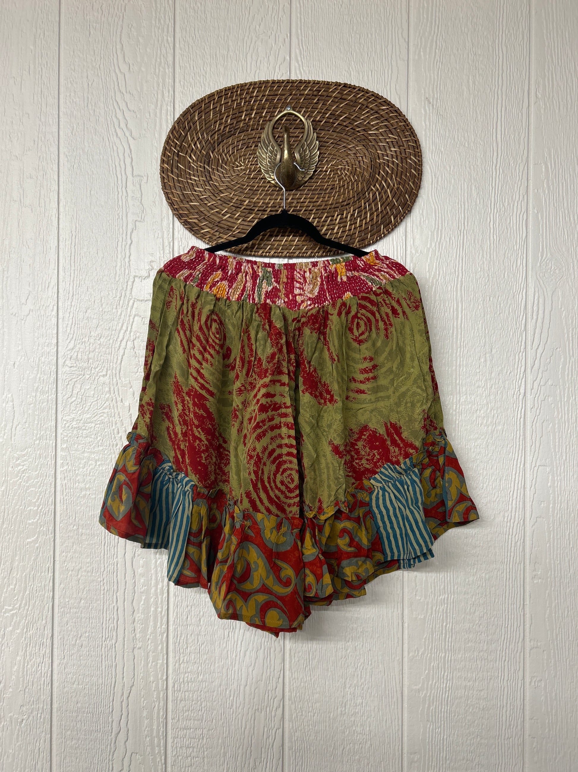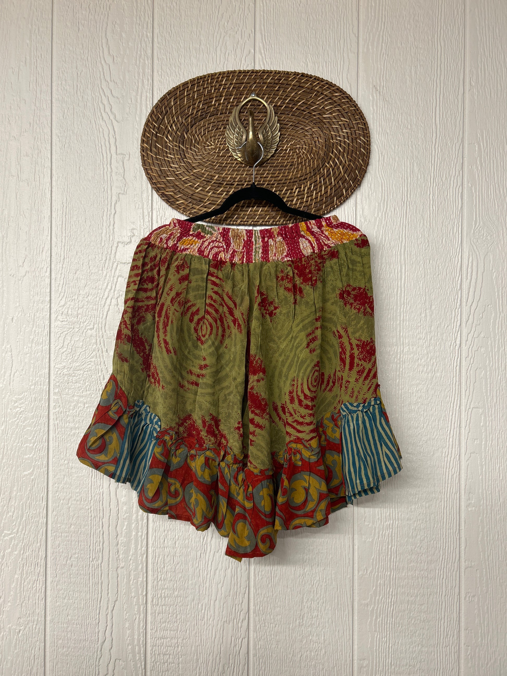 Crafted from vintage crepe sari, our Lover Cropped Culotte features interior pockets, a ruffle hem, stretchy kantha waist and hits at the knee.