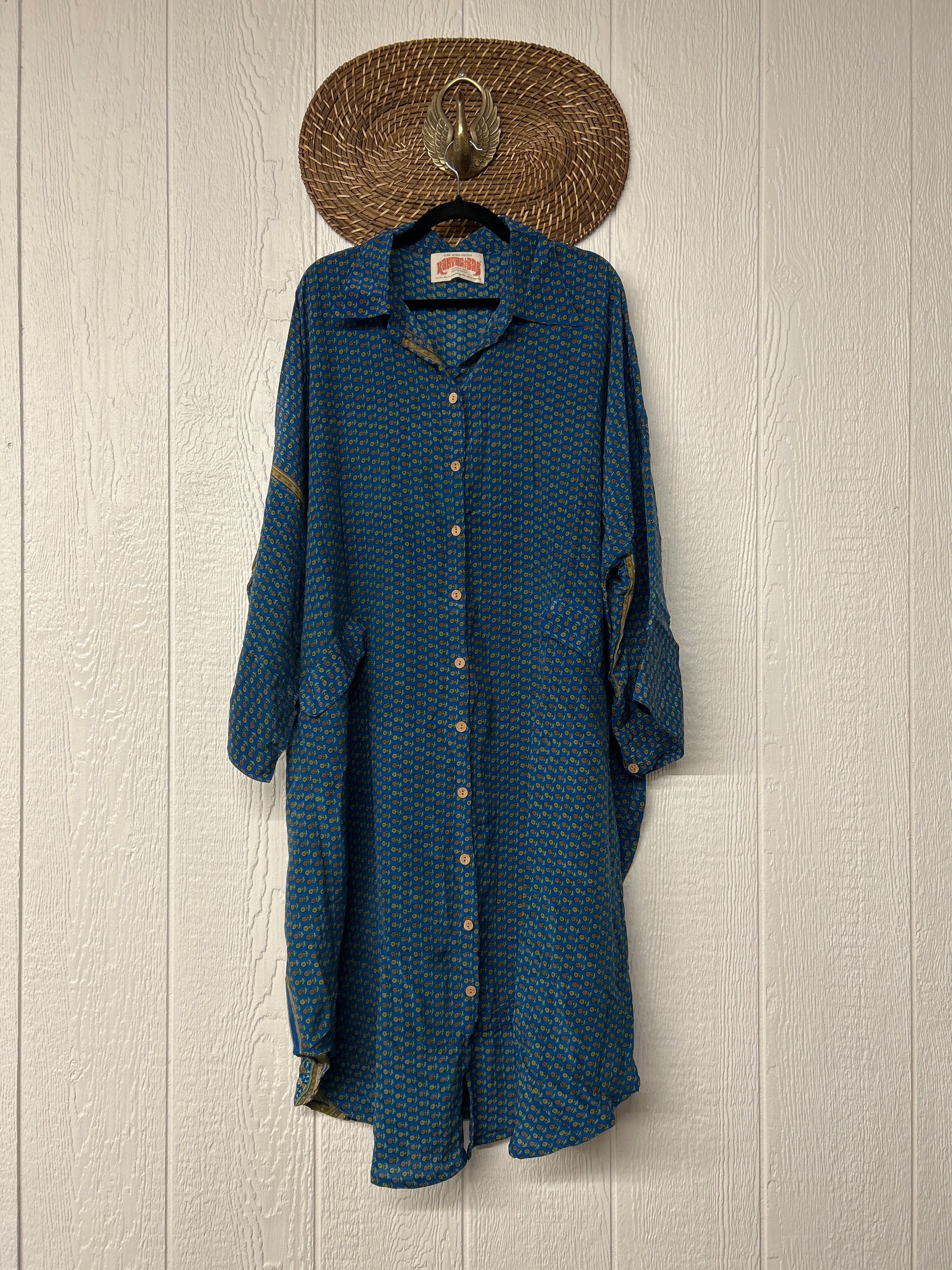 Made from our vintage crepe sari, this billowy dream functional buttons, two deep pockets in the front, dreamy longsleeves and a curved bottom.