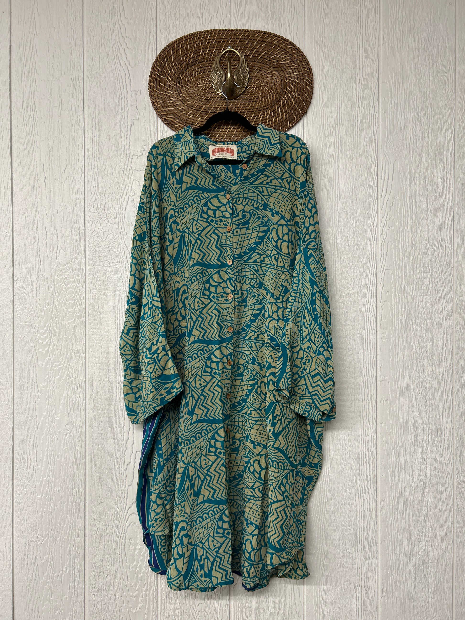 Made from our vintage crepe sari, this billowy dream functional buttons, two deep pockets in the front, dreamy longsleeves and a curved bottom.