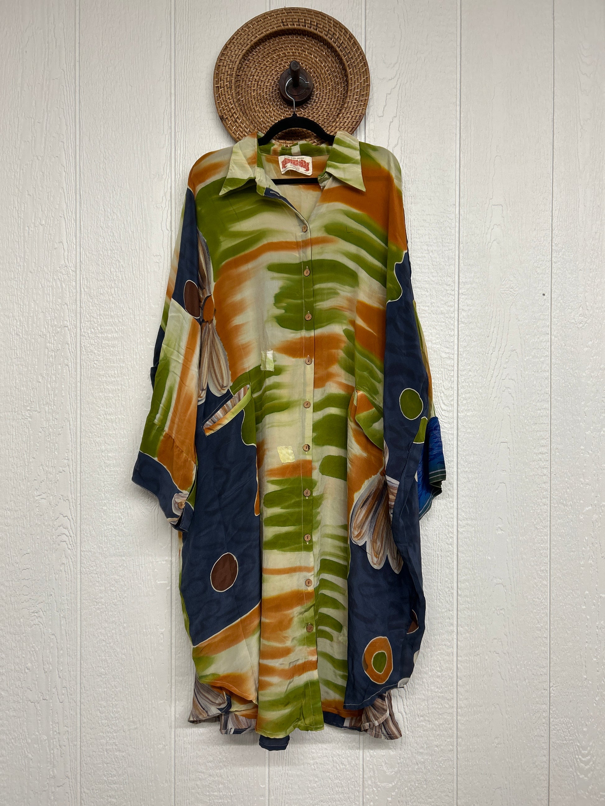 Made from our vintage crepe sari, this billowy dream functional buttons, two deep pockets in the front, dreamy longsleeves and a curved bottom.