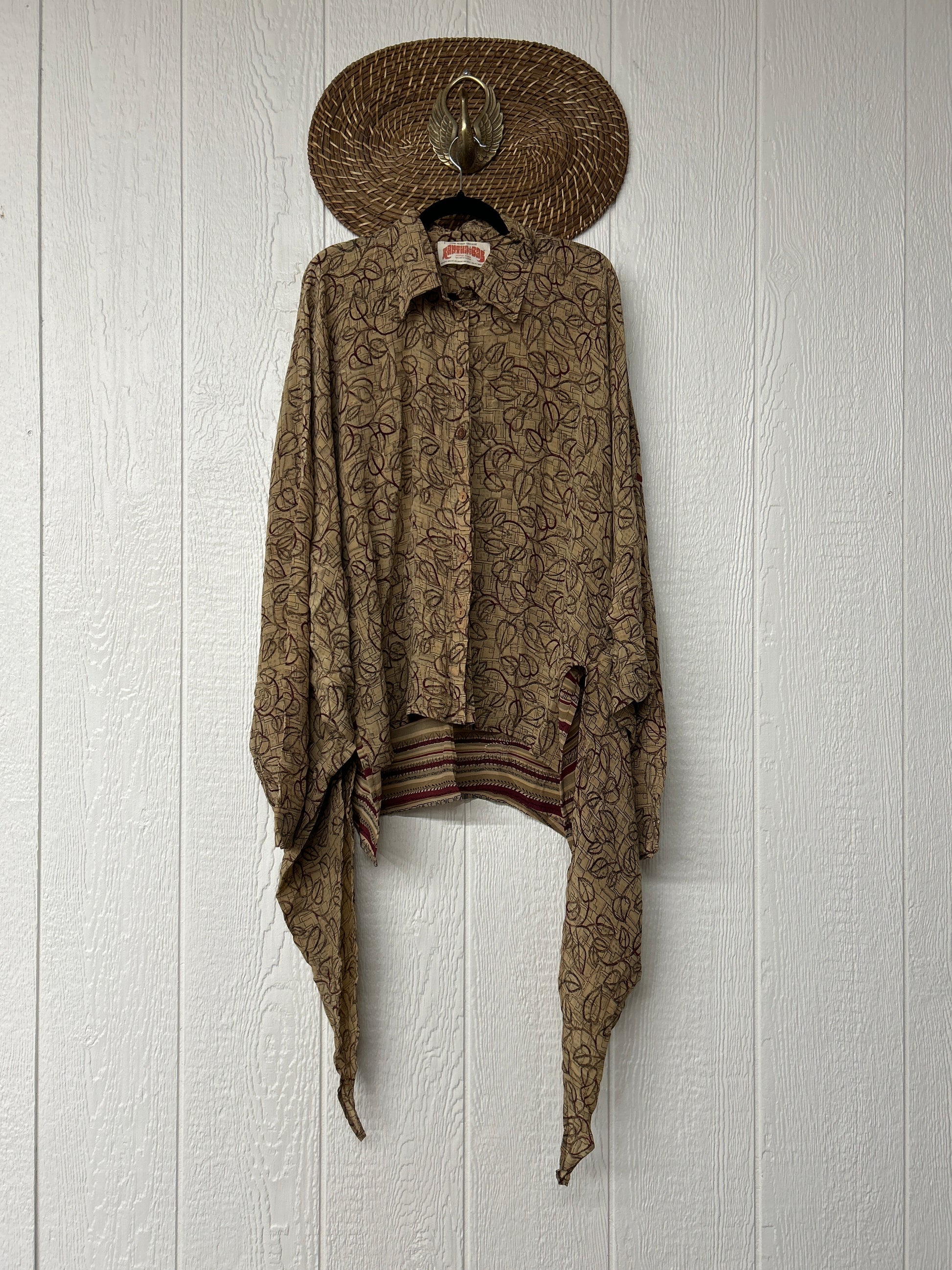 Crafted from our ultra lux vintage crepe sari this floaty dream features a Button-down placket with a high low hem, collar, and button cuffs.