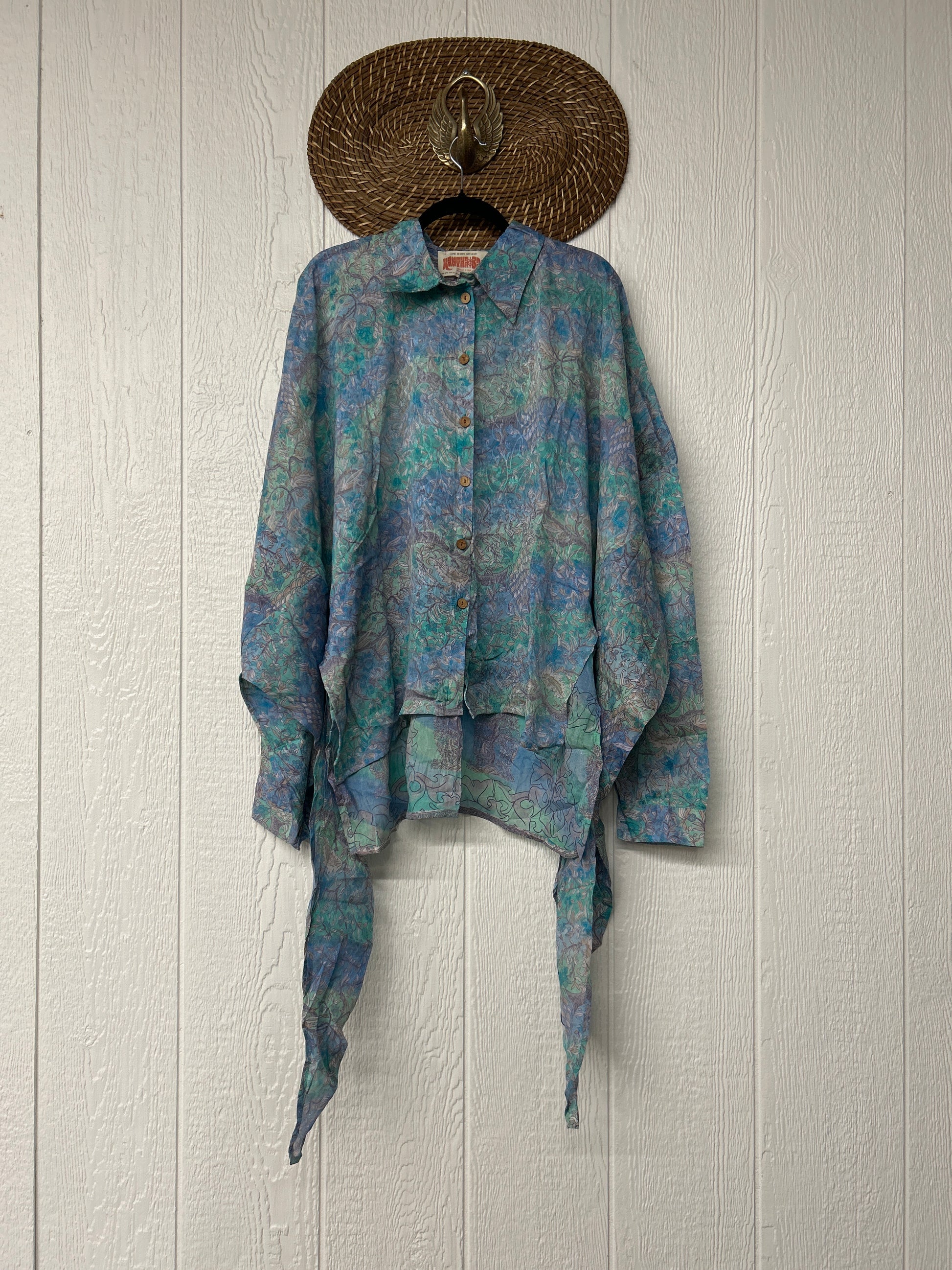 Crafted from our ultra lux vintage crepe sari this floaty dream features a Button-down placket with a high low hem, collar, and button cuffs.