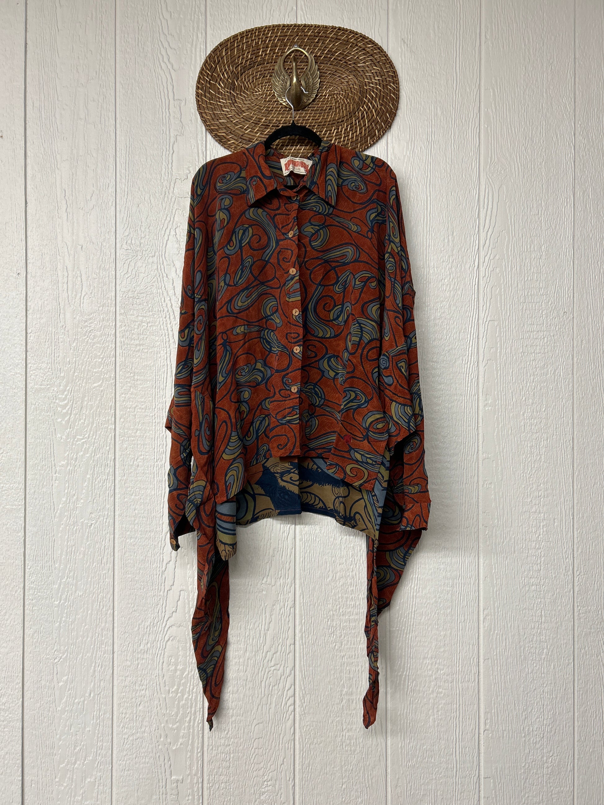 Crafted from our ultra lux vintage crepe sari this floaty dream features a Button-down placket with a high low hem, collar, and button cuffs.