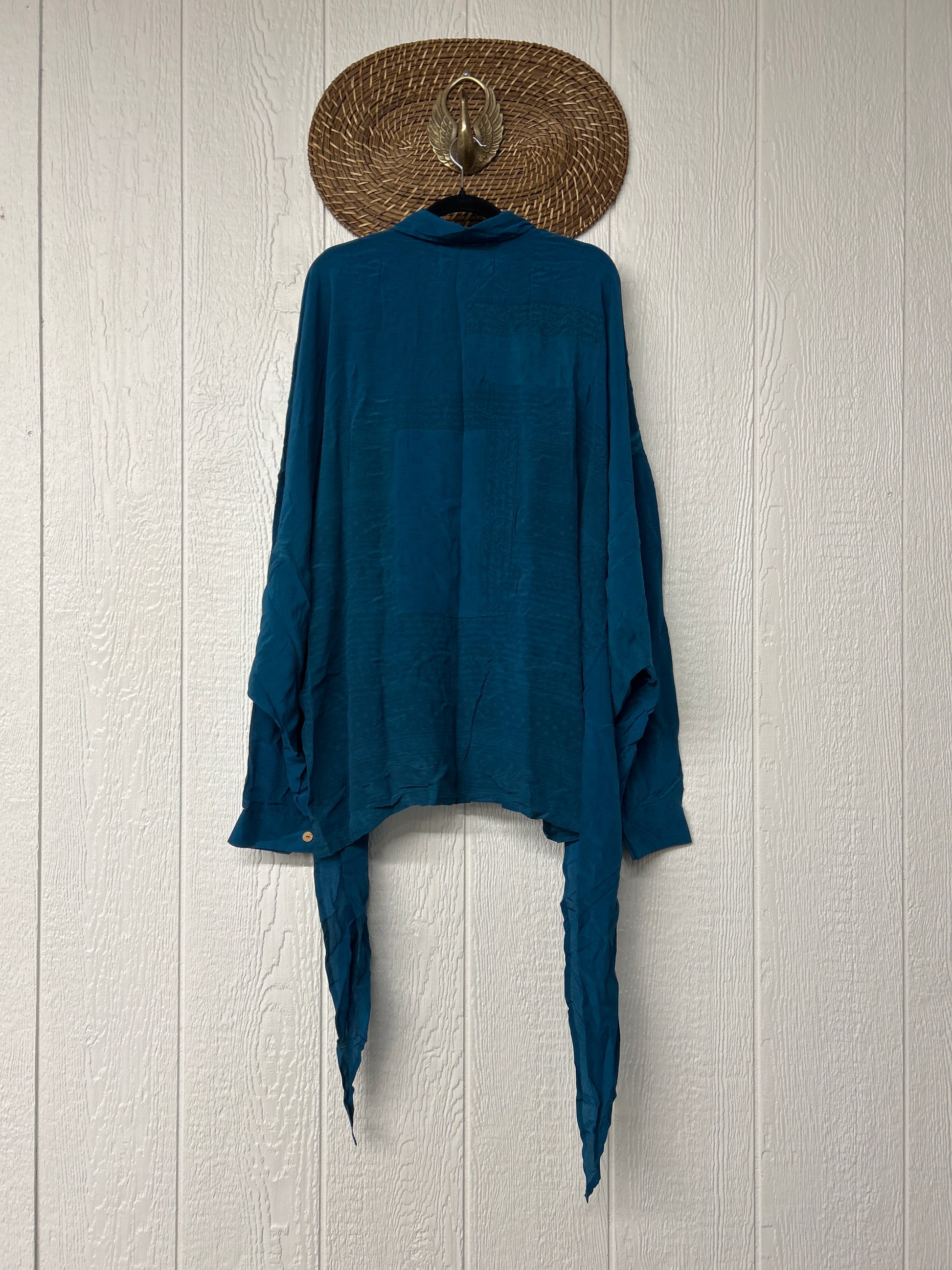 Crafted from our ultra lux vintage crepe sari this floaty dream features a Button-down placket with a high low hem, collar, and button cuffs.