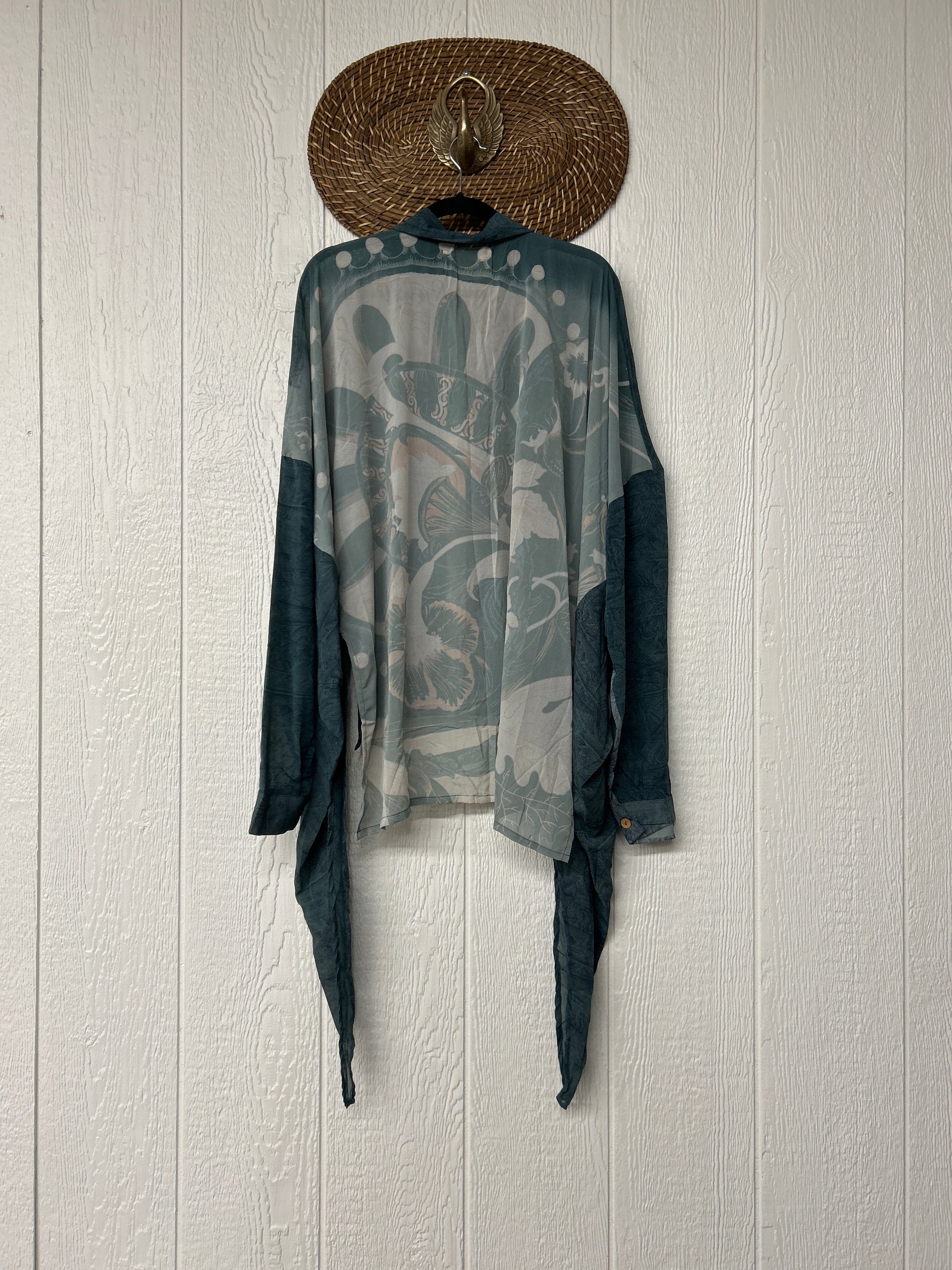 Crafted from our ultra lux vintage crepe sari this floaty dream features a Button-down placket with a high low hem, collar, and button cuffs.