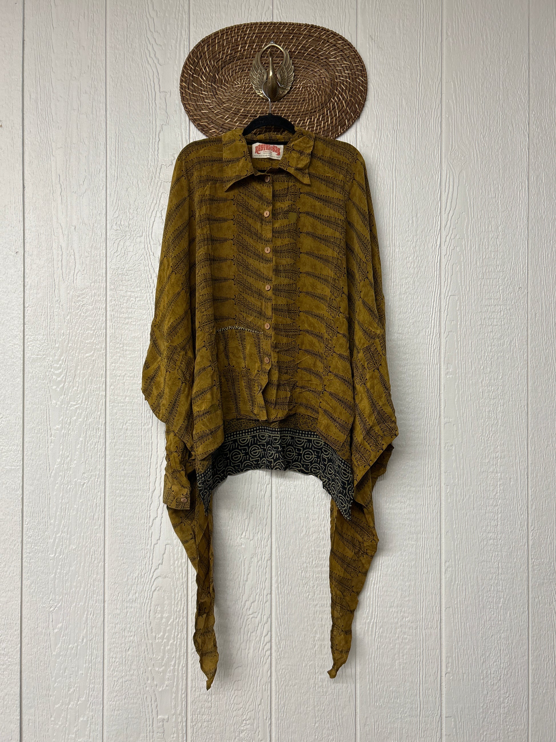 Crafted from our ultra lux vintage crepe sari this floaty dream features a Button-down placket with a high low hem, collar, and button cuffs.